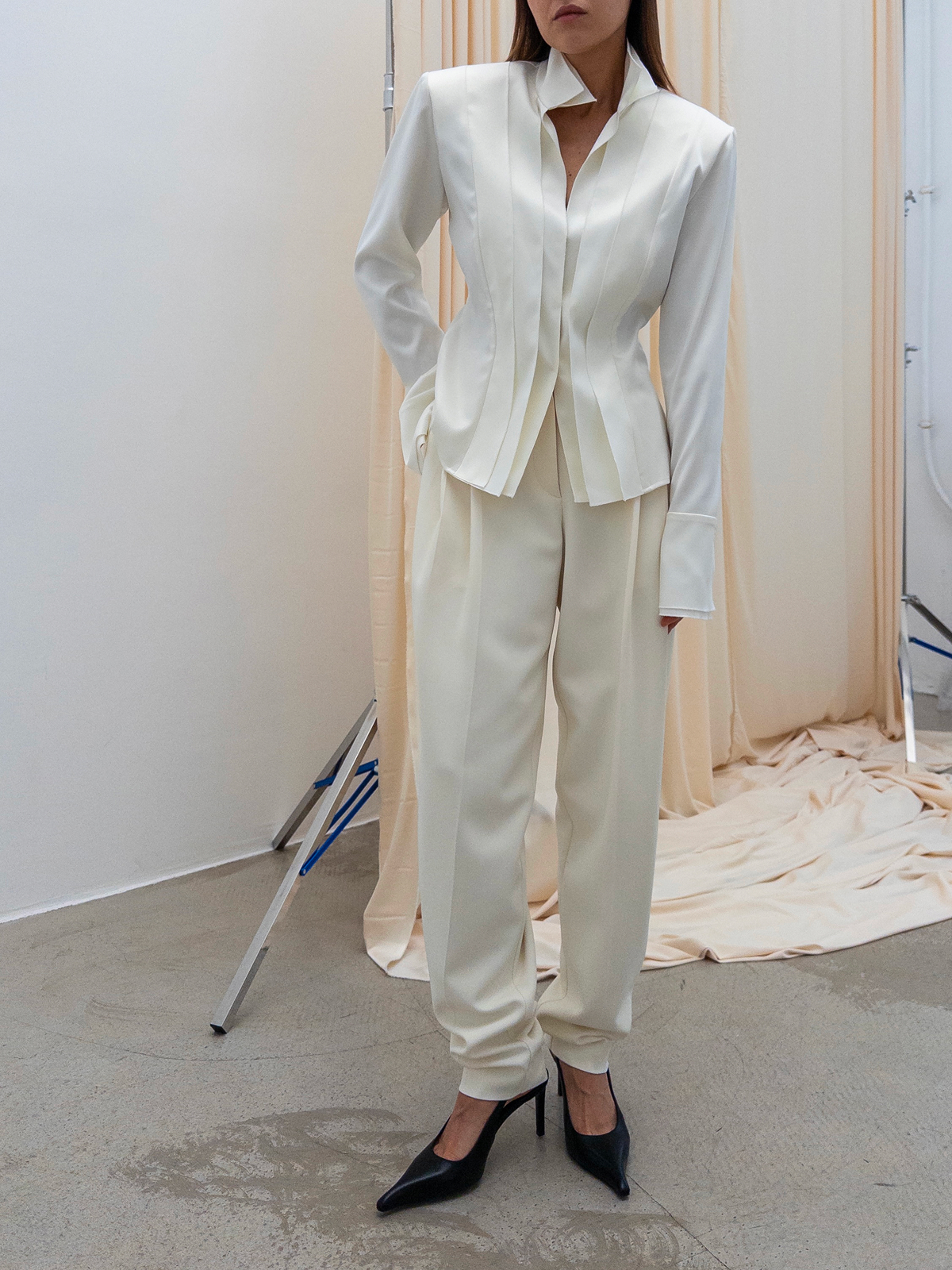 Приталенные силуэты возвращаются в более мягкой интерпретации. Это не жёсткое облегание, а деликатное подчеркивание фигуры, которое добавляет образу женственности. Современный приталенный крой, как у рубашки VEGA и блузы LINER, достигается за счёт мягких вытачек, естественной драпировки ткани и продуманного распределения объема в области бёдер. Такой подход исключает ощущение скованности, сохраняя при этом чёткость линий.