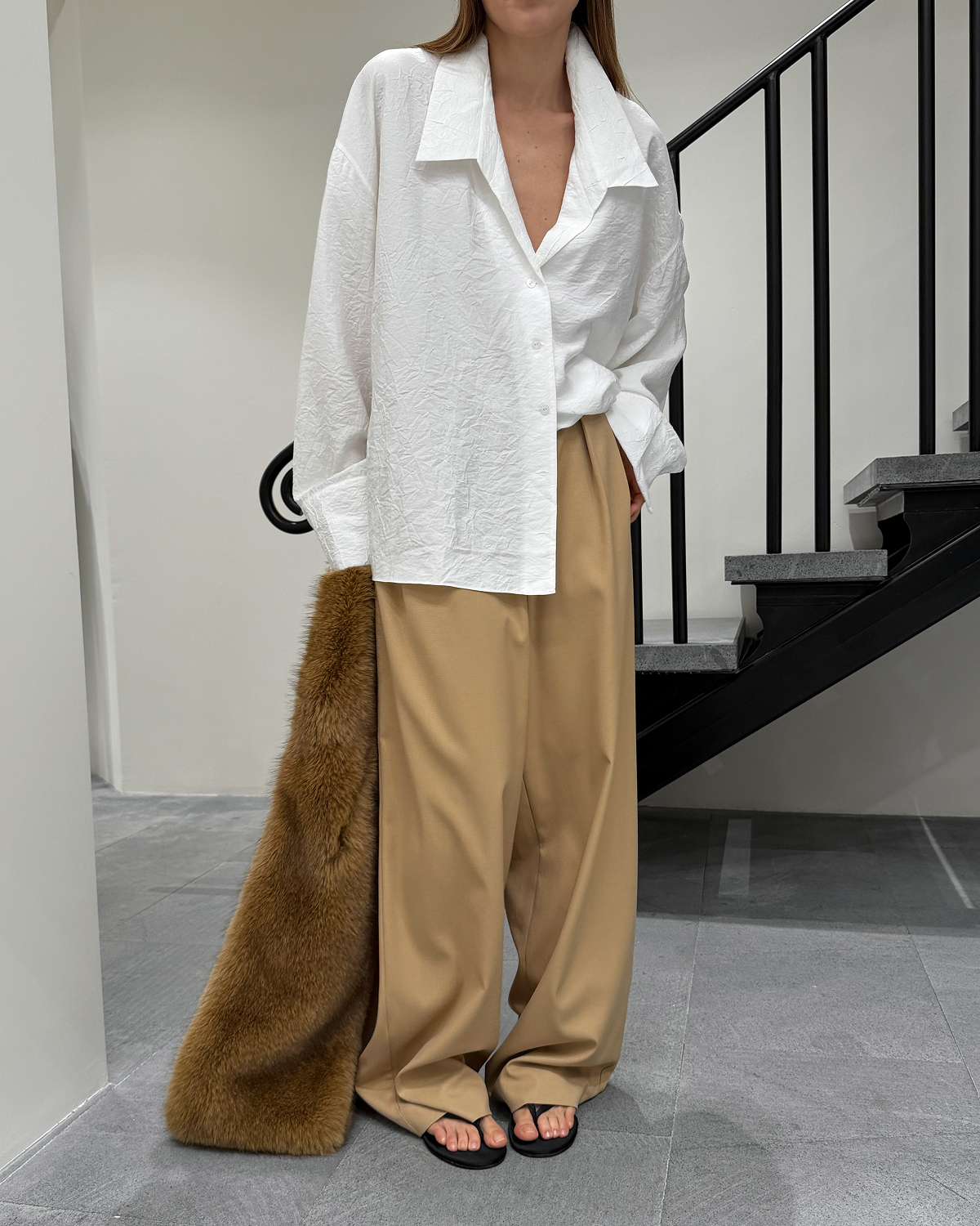 Прямой крой — выбор для тех, кто ценит баланс между классикой и актуальностью. Он сохраняет структуру, но при этом не выглядит строго. Вертикальные линии визуально вытягивают пропорции, делая образ более подтянутым и гармоничным. Прямая рубашка, например, блуза AFTER LOVE, прекрасно работает в роли самостоятельного верха, а также служит идеальной базой для сложных слоев: под жилеты, жакеты или плотные трикотажные кардиганы.