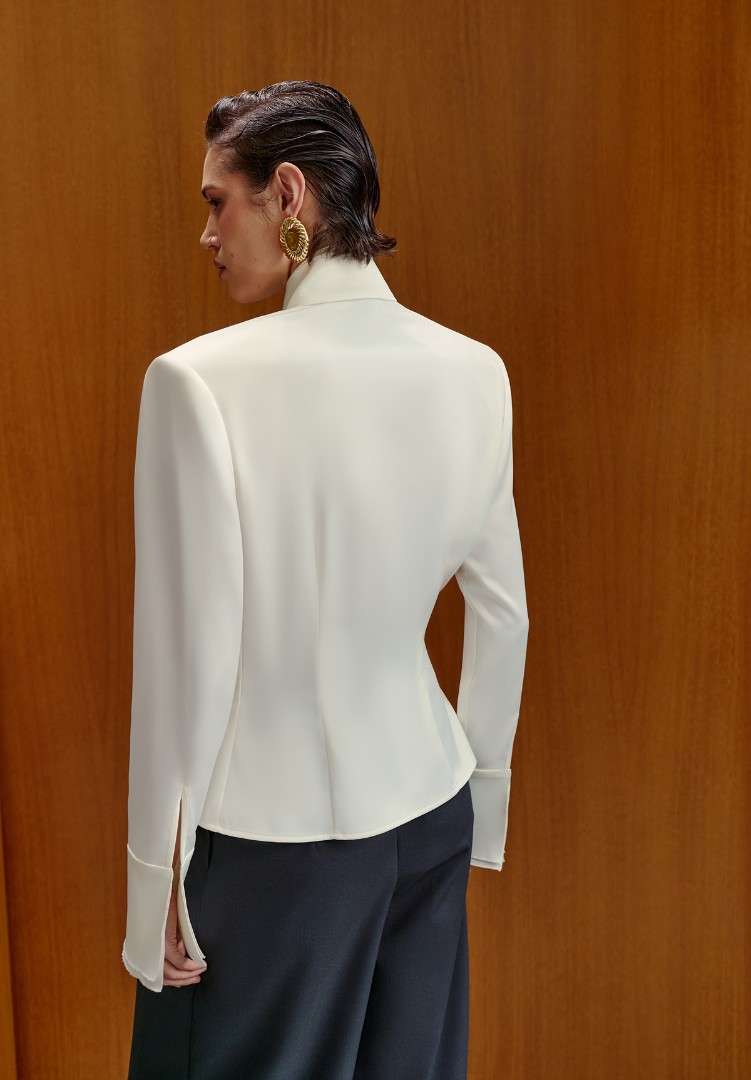 Блуза в молочном оттенке с двойным воротником и манжетами – классический вариант, подходящий как для повседневных, так и для торжественных случаев.