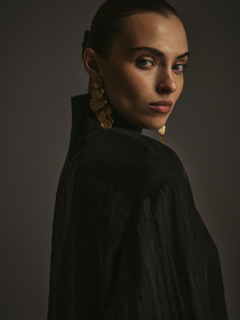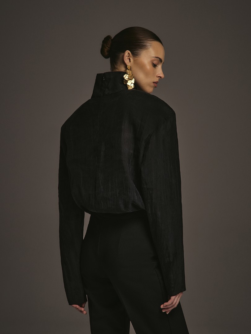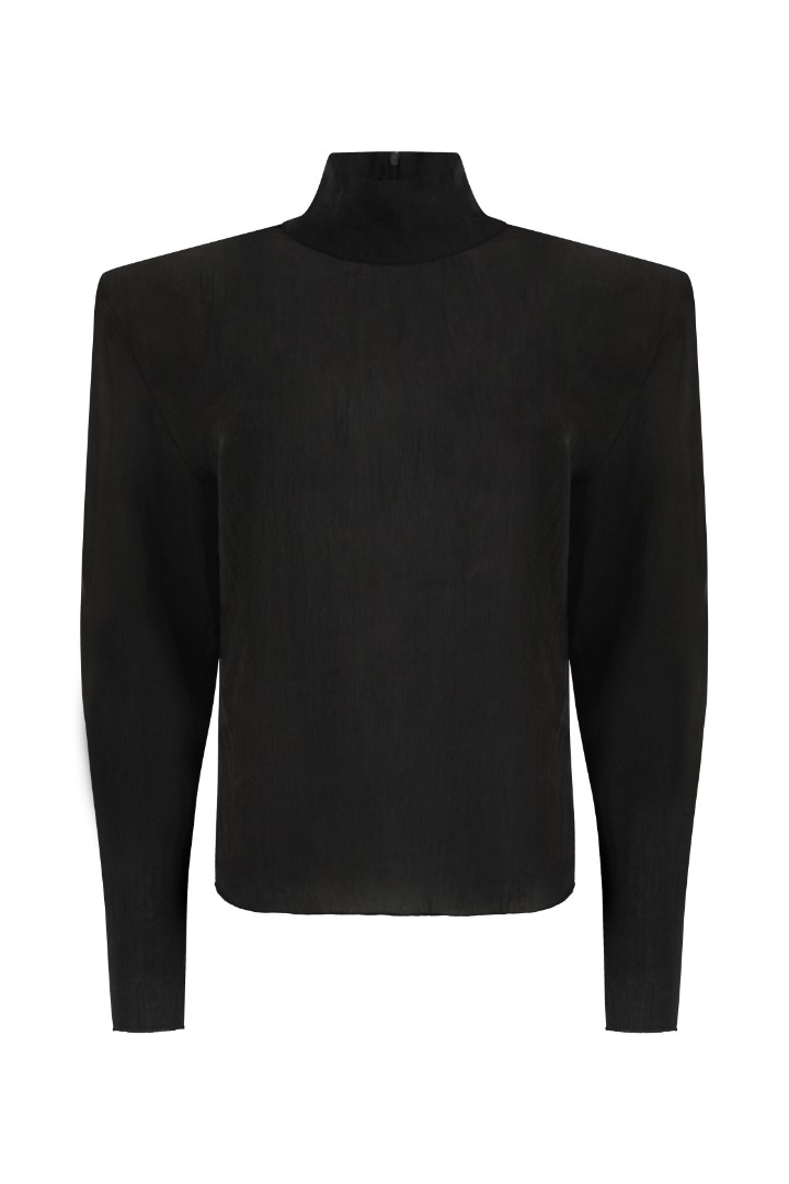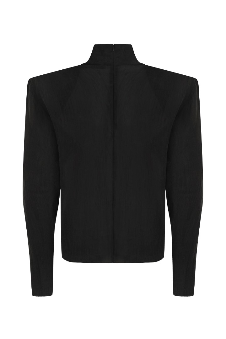 Блуза из фактурной ткани с деликатным сатиновым блеском. Графичные подплечники, воротник-стойка и удлиненные рукава. Застежка на потайную молнию сзади.