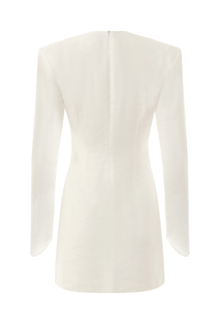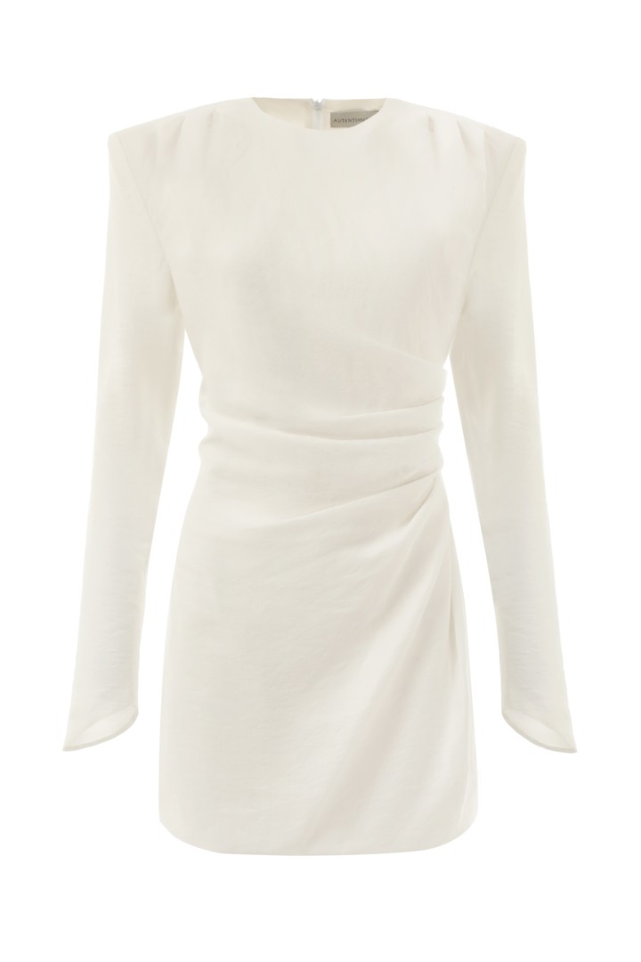 Блуза приталенного силуэта на подкладке с асимметричной драпировкой на талии. Круглый вырез, подплечники и удлиненные рукава со скошенным низом. Потайная застежка на молнию сзади.