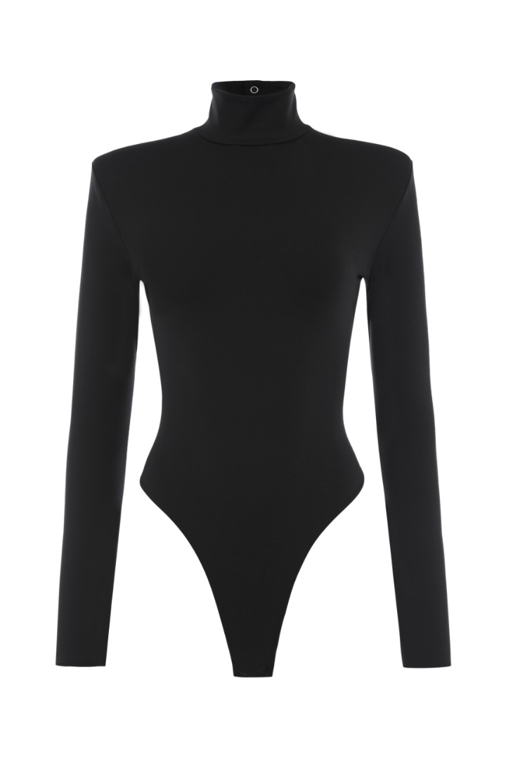 Трикотажное боди с длинным рукавом. Модель с посадкой high-leg, воротником-стойкой, глубоким вырезом на спине и вшитыми подплечниками. Застежка на черные кнопки на воротнике и ластовице. Облегающее боди станет безупречной основой как повседневных аутфитов с джинсами, так и элегантных вечерних образов.