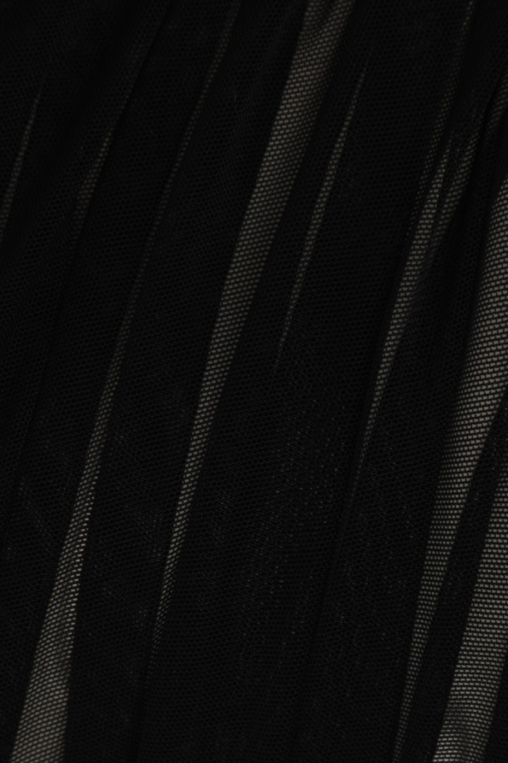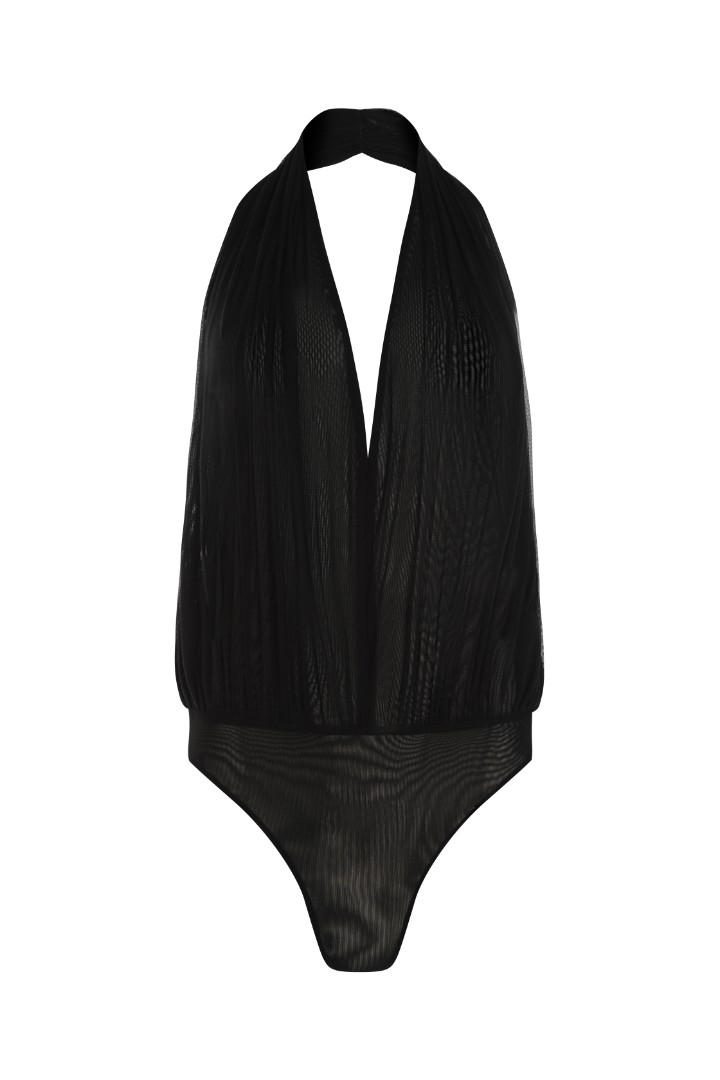 Боди из эластичной полупрозрачной сетки с открытой спиной. Глубокий вырез и скульптурная драпировка по всей длине.