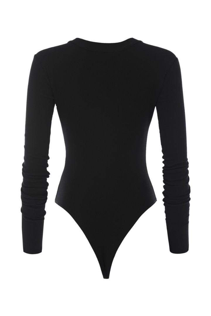Боди на пуговицах из эластичного трикотажа в рубчик. V-образный вырез, комфортная посадка high-leg и удлиненные рукава. Застежка на кнопки на ластовице.