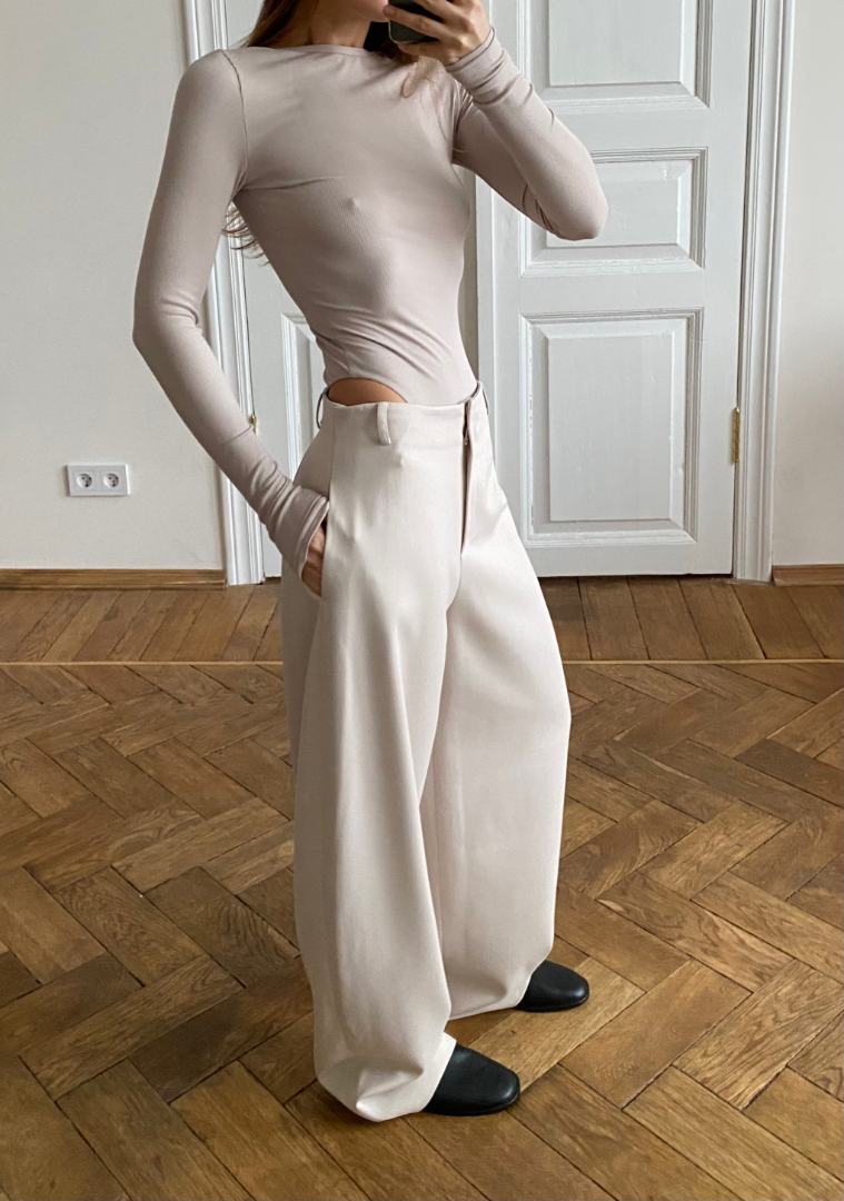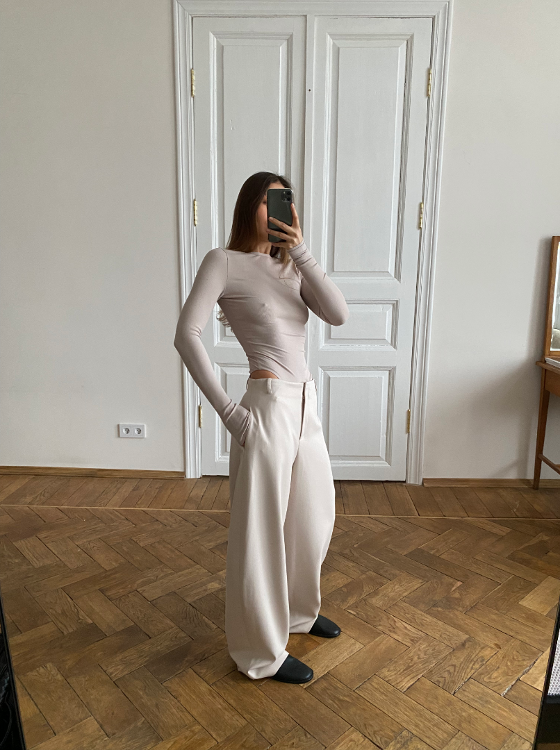 Боди из плотного эластичного трикотажа в рубчик. Модель с открытой спиной, удлинёнными рукавами и вырезом-лодочкой. Застёжка на кнопки на ластовице.