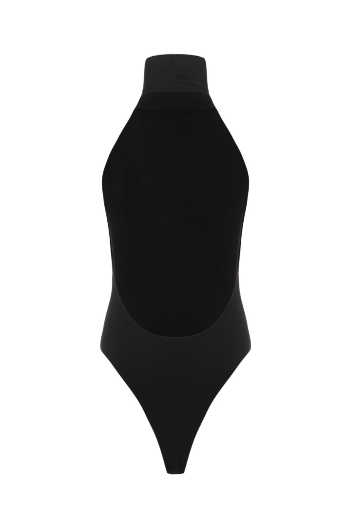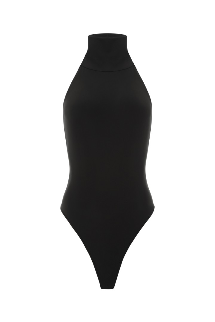 Боди из бифлекса с американской проймой и высоким воротником-стойкой. Глубокий вырез на спине, комфортная посадка high-leg и застежка на кнопки на ластовице с регулировкой длины.