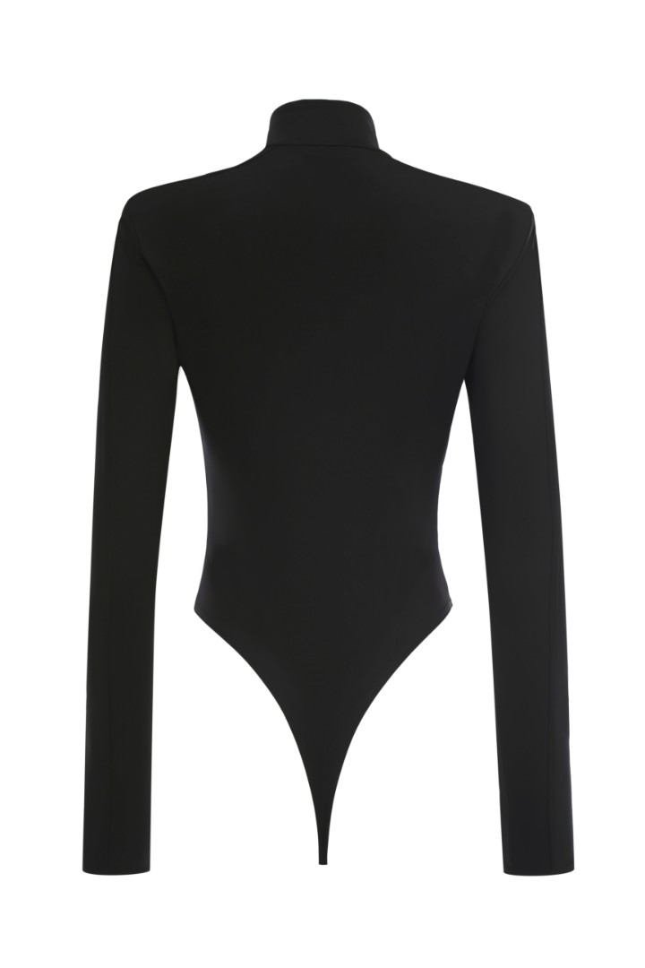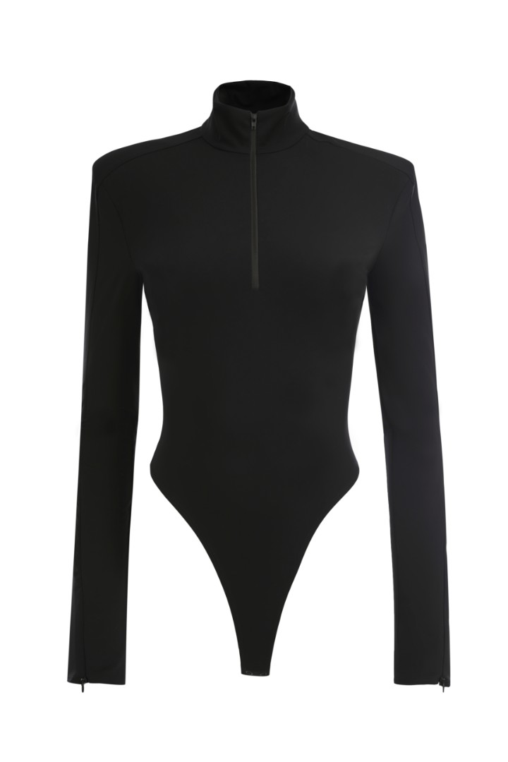 Облегающее боди в стиле sport-chic. Комфортный вырез high-leg, воротник-стойка в шитые подплечники. Рукава и горловина застегиваются на молнию.