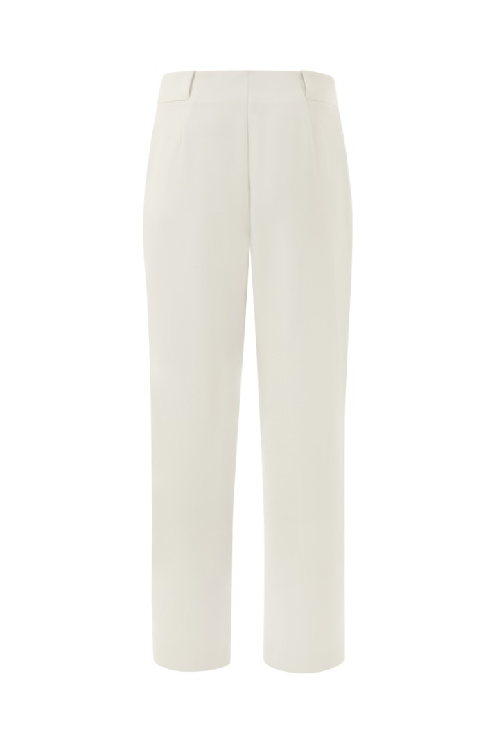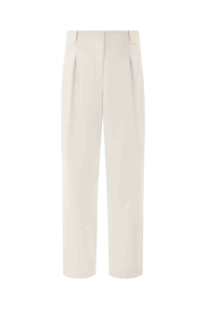 Брюки прямого силуэта с защипами из костюмной ткани. Модель с боковыми карманами, застежкой на молнию спереди и цельнокроеным поясом, переходящим в шлевки.