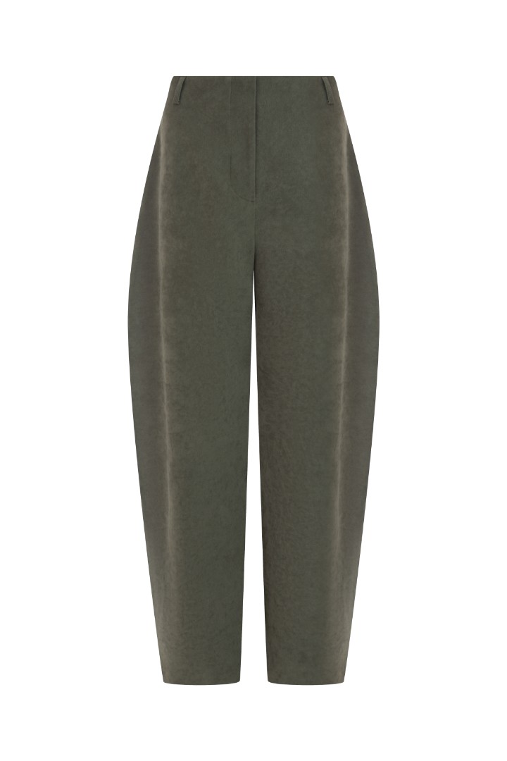 Брюки о-силуэта из микровельвета на подкладке. Высокая посадка, свободный крой и зауженные к низу брючины. Карманы в боковых швах.