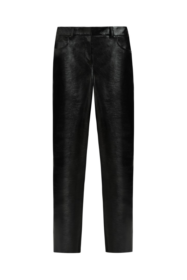 Лаковые брюки прямого кроя. Модель со средней посадкой и полной длиной дополнена карманами в боковых швах и шлевками для ремня.