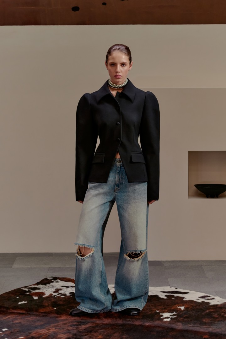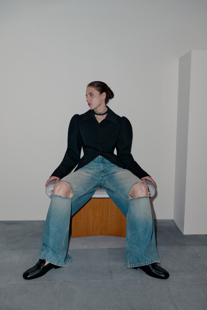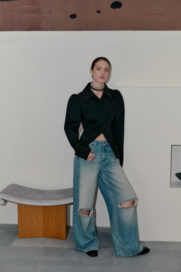 Джинсы силуэта relaxed fit: прямые от бедра штанины, свободный крой и средняя посадка. Модель из плотного денима с лекгим эффектом потертости декорирована разрезами на коленях.