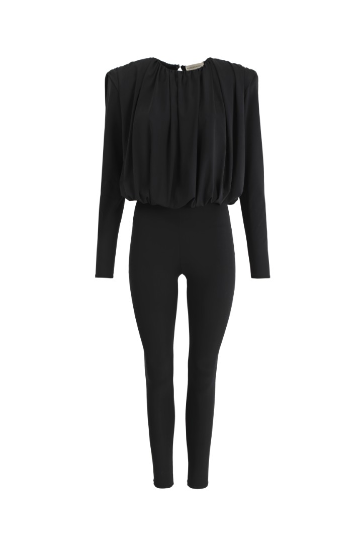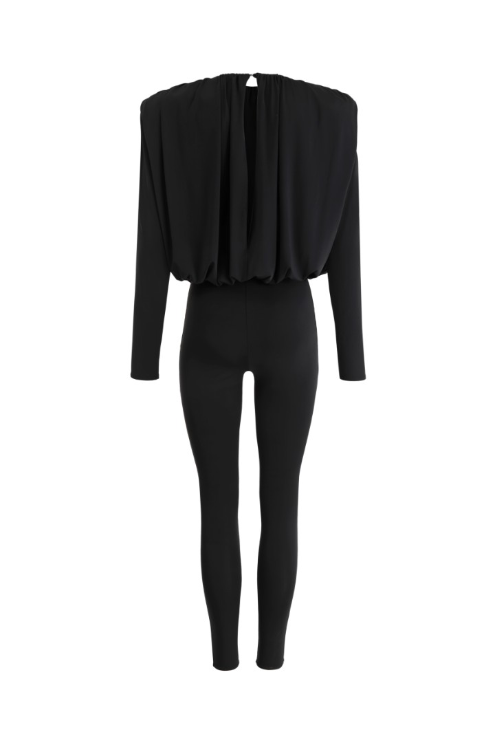 Комбинезон из бифлекса. Верхняя часть выполнена в виде блузы с длинными рукавами, графичными подплечниками и драпировками по всей длине с вырезом на спине. Застежка на одну пуговицу сзади. Низ комбинезона – облегающие леггинсы с легким моделирующим эффектом.