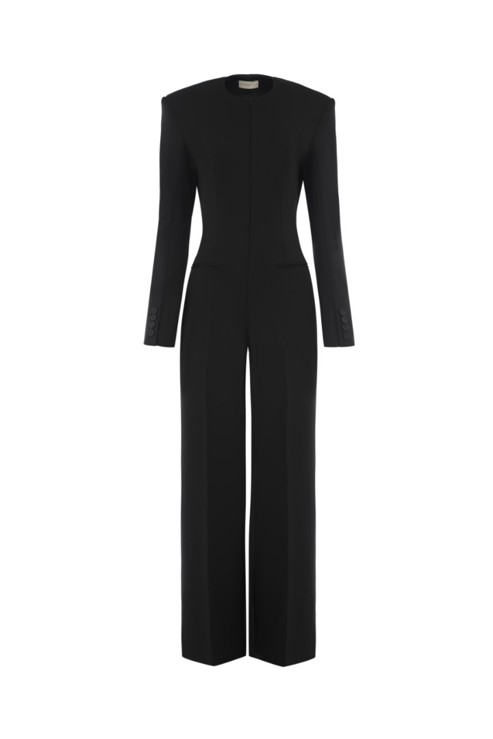 Комбинезон из костюмной ткани с длинными рукавами. Верхняя часть с подплечниками, пуговицами на шлице рукава и декоративными прорезными карманами. Застежка на потайную молнию спереди. Брюки со стрелками по всей длине дополнены карманами в боковых швах.