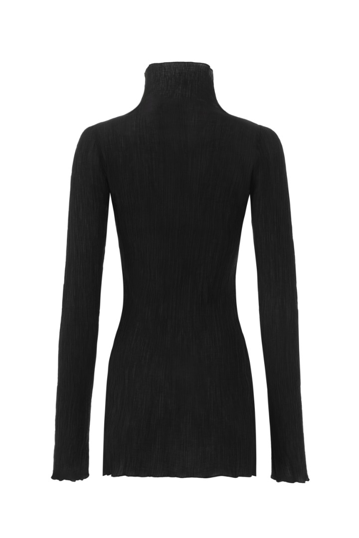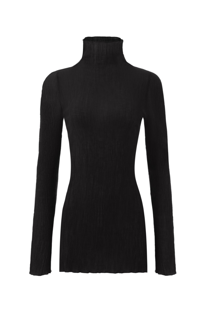 Удлиненный лонгслив приталенного кроя из фактурной жатой ткани. Изделие с воротником-стойкой и длинными рукавами. Подходящий вариант базового лонгслива для тех, кто устал от стандартных текстур, но так же ценит комфорт и точеную простоту.