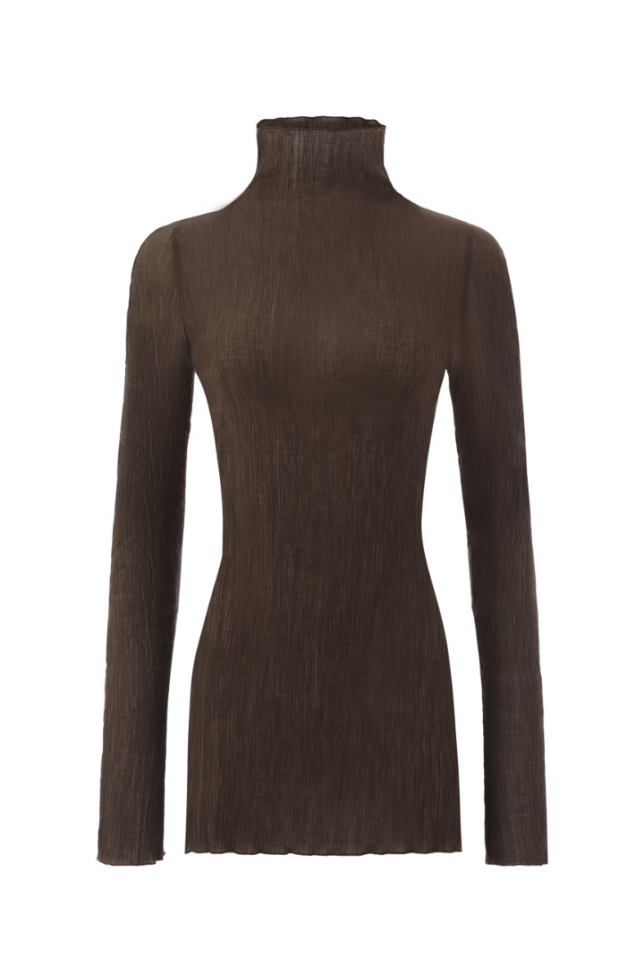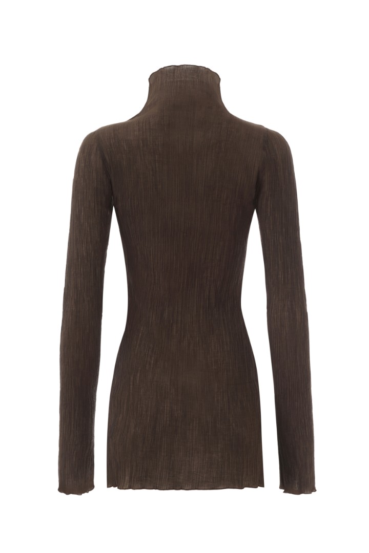 Удлиненный лонгслив приталенного кроя из фактурной жатой ткани. Изделие с воротником-стойкой и длинными рукавами. Подходящий вариант базового лонгслива для тех, кто устал от стандартных текстур, но так же ценит комфорт и точеную простоту.