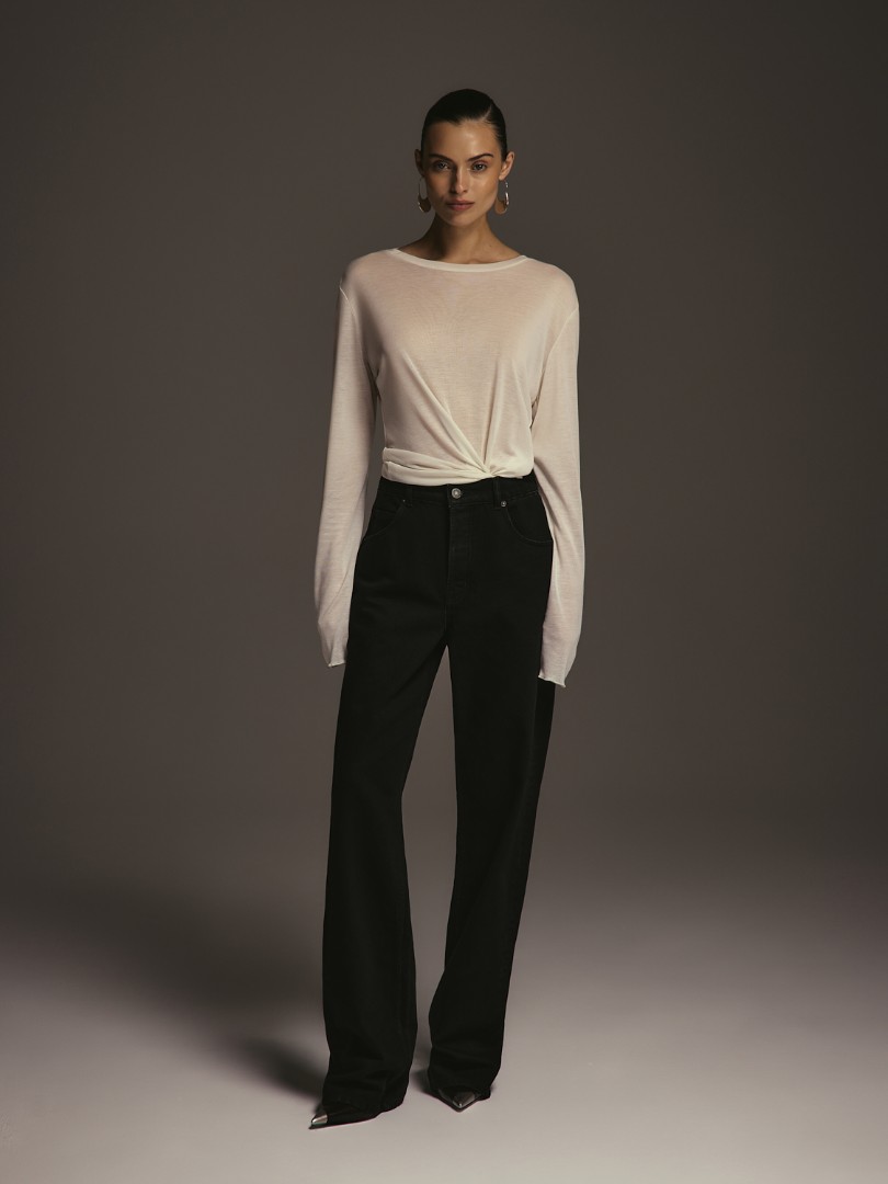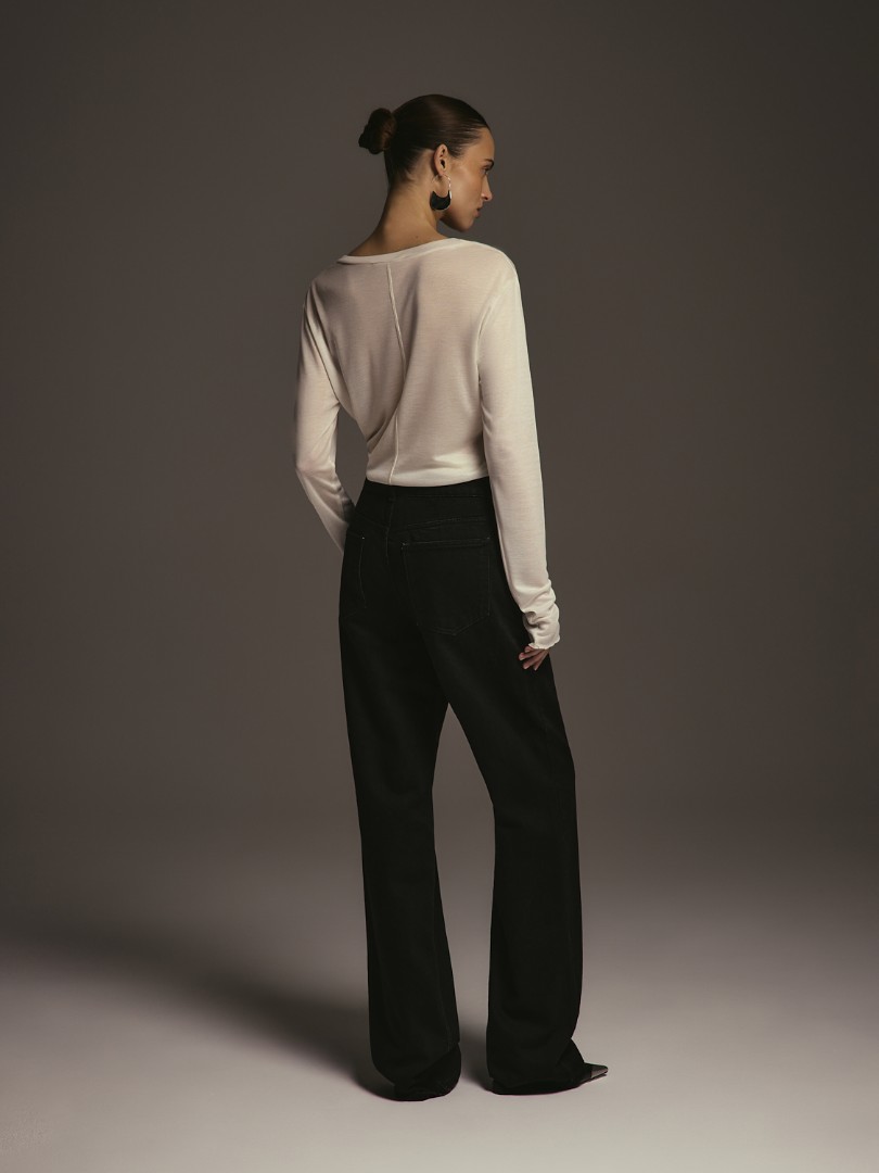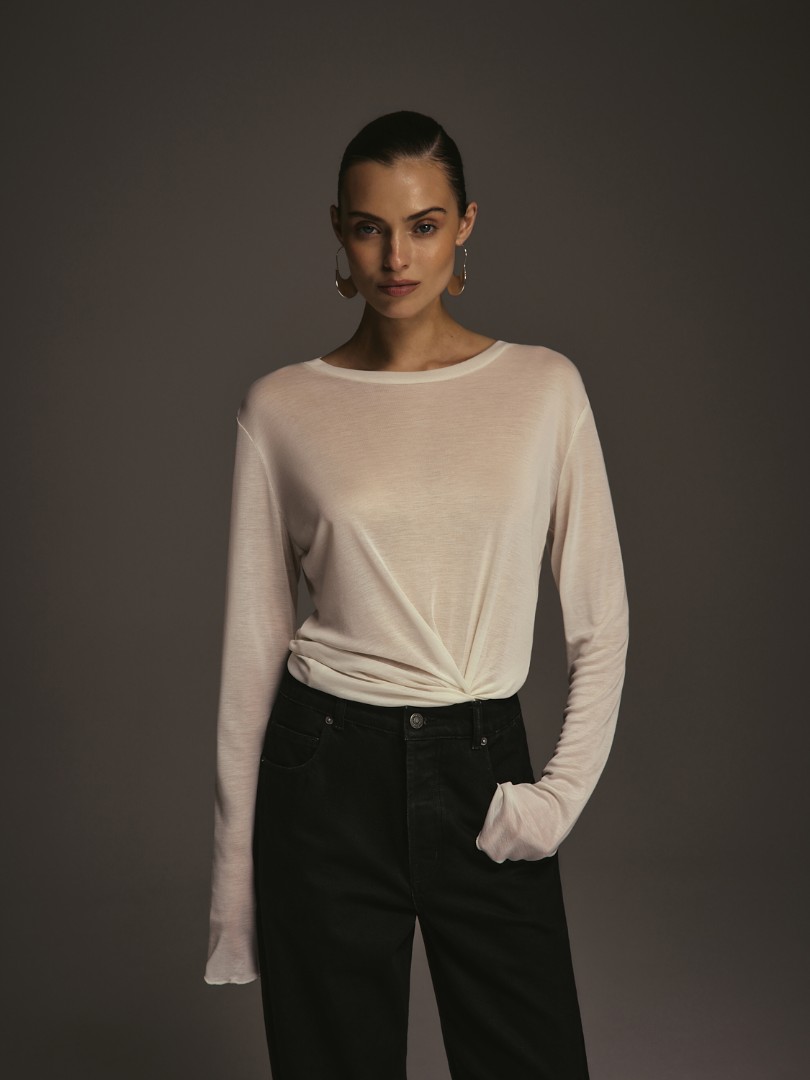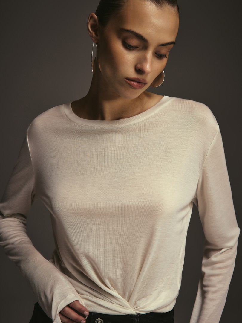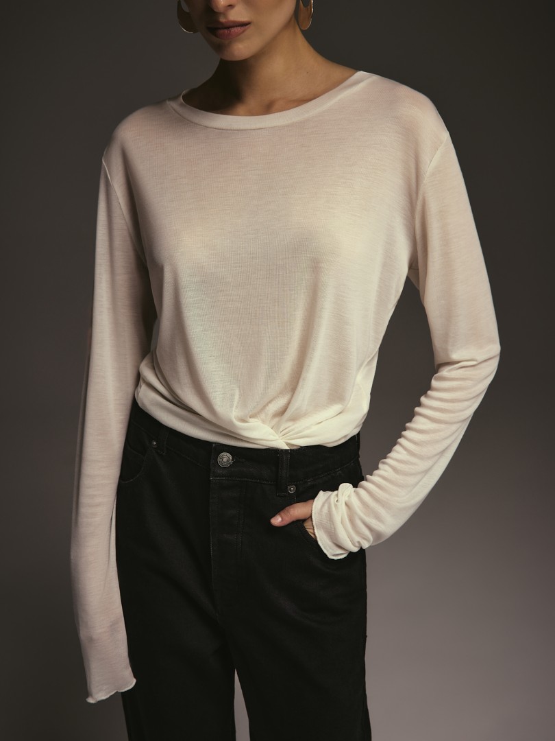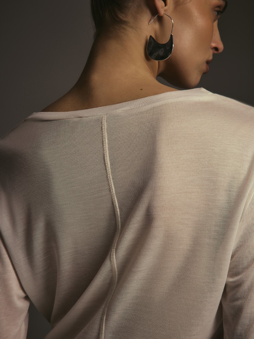 Базовый полупрозрачный лонгслив свободного кроя. Модель из мягкого эластичного трикотажа с круглым вырезом, удлиненными рукавами и швом по спинке.