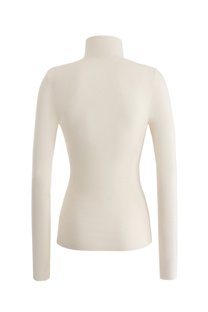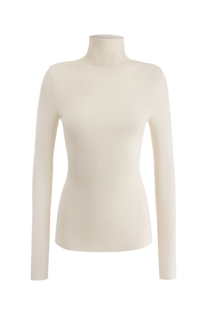 Базовый лонгслив облегающего кроя в рубчик. Модель из мягкой шерсти с воротником-стойкой и удлиненными рукавами.