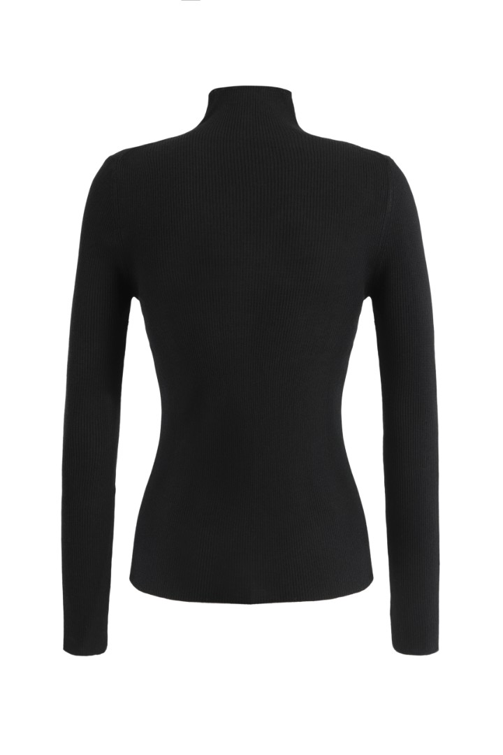 Базовый лонгслив облегающего кроя в рубчик. Модель из мягкой шерсти с воротником-стойкой и удлиненными рукавами.