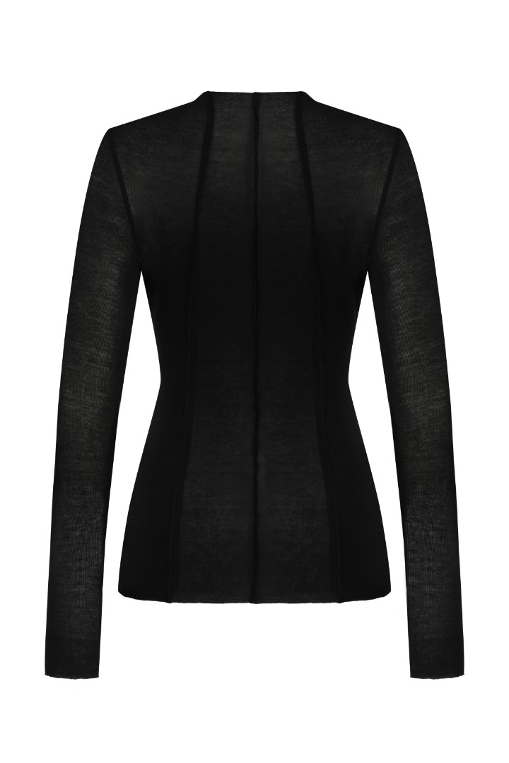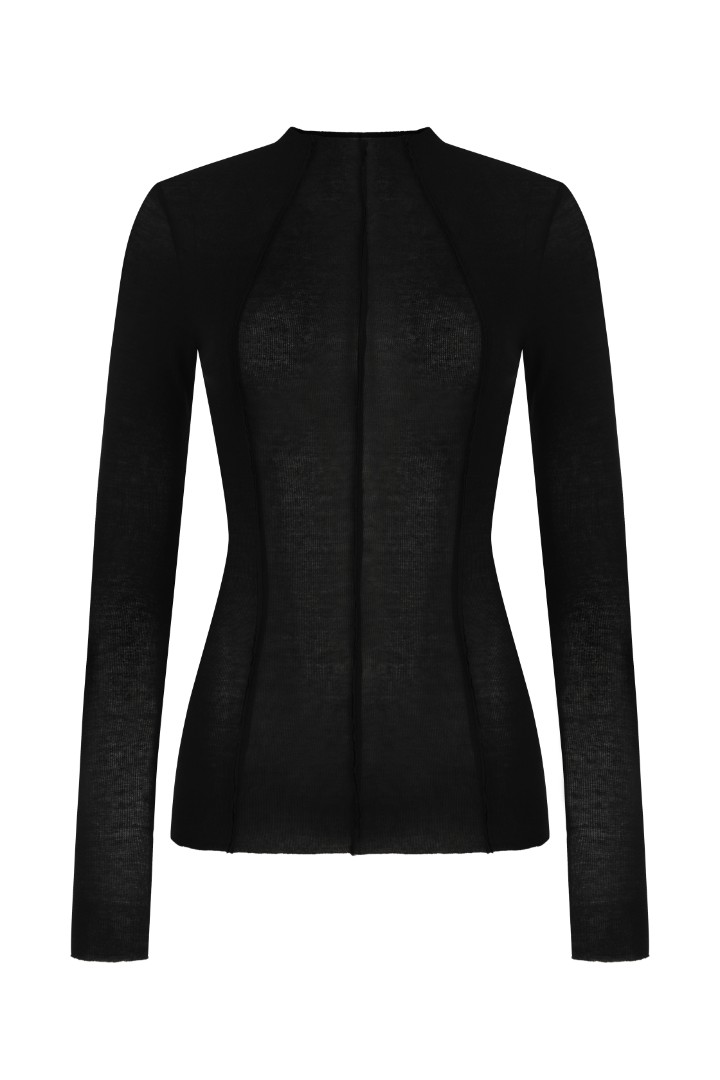 Лонгслив с воротником-стойкой и удлиненными рукавами. Модель из эластичного трикотажа декорирована фактурными швами с необработанным краем.