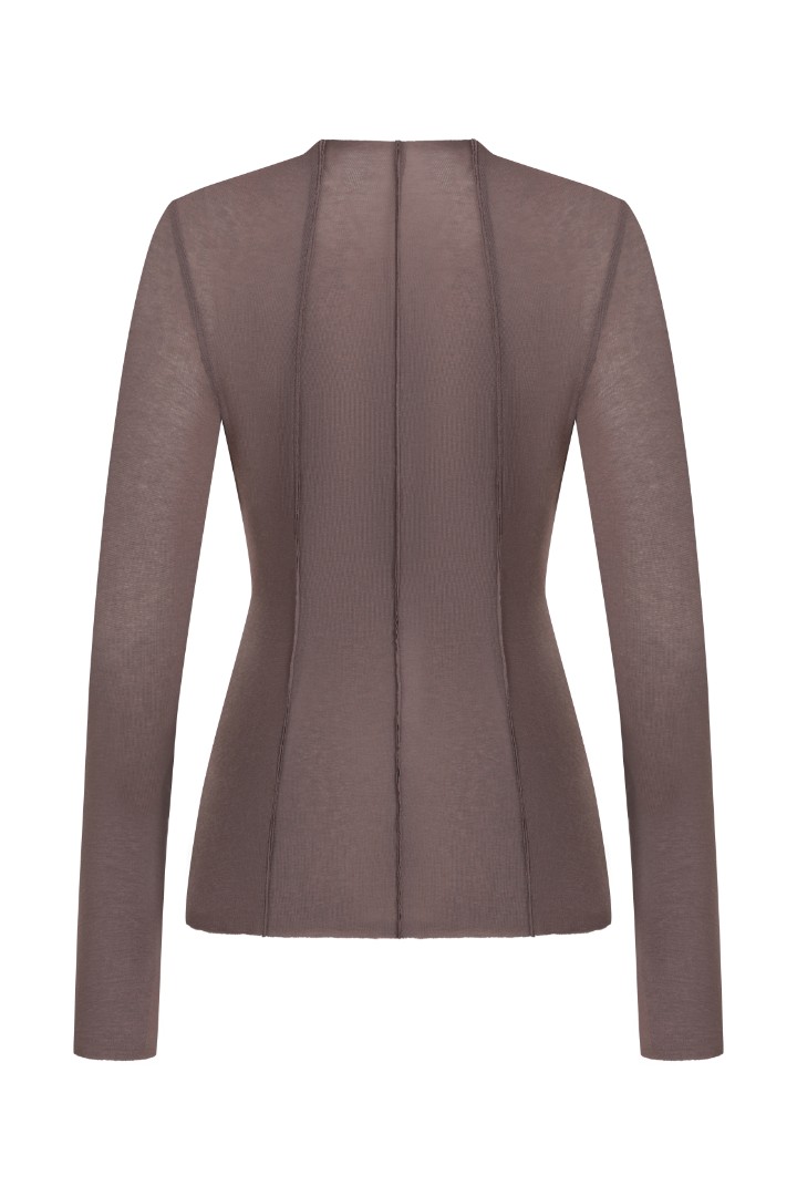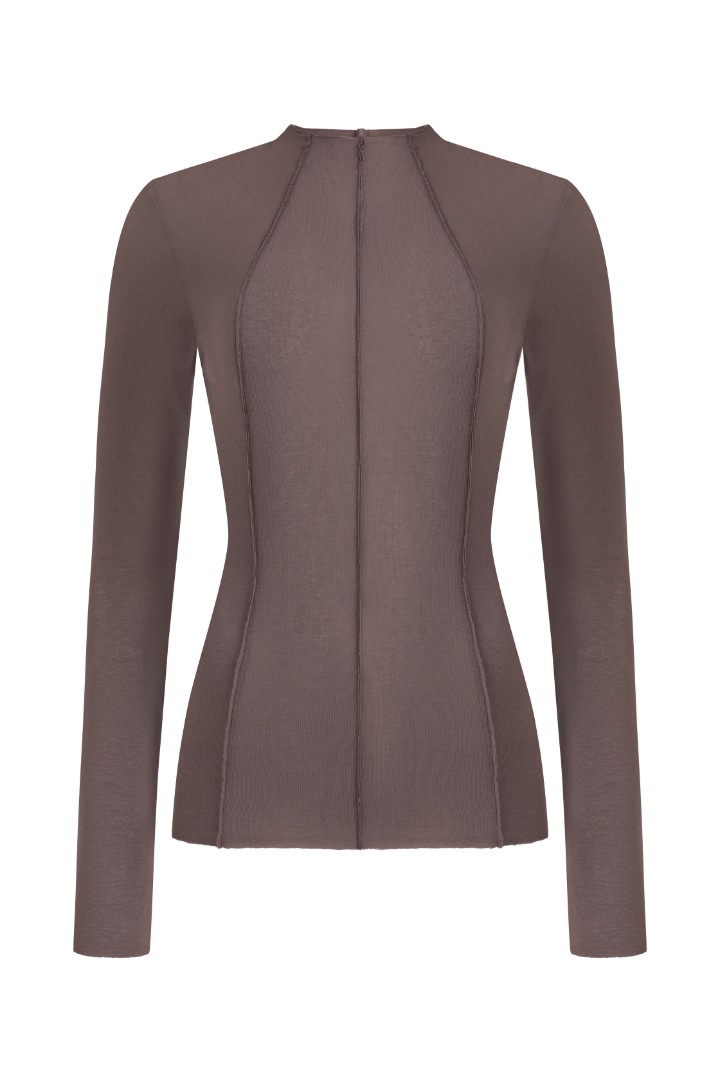 Лонгслив с воротником-стойкой и удлиненными рукавами. Модель из эластичного трикотажа декорирована фактурными швами с необработанным краем.