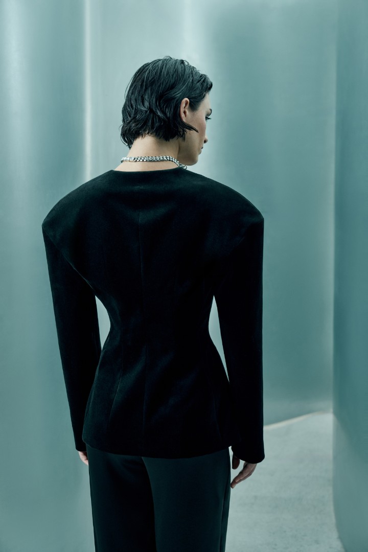 Приталенный жакет с акцентной плечевой линией, выполненный из костюмной бархатной ткани, которая придаст любому образу эксклюзивности и характера.
