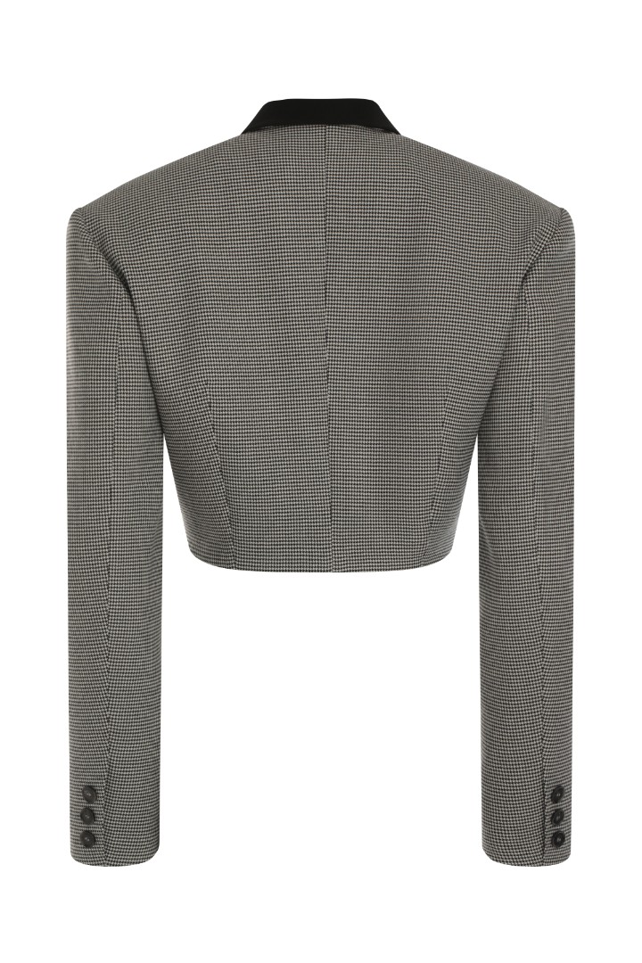 Укороченный жакет приталенного кроя на подкладке. Модель с подплечниками и заостренными лацканами. Контрастная черная вставка на воротнике.
