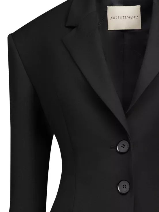 Однобортный приталенный жакет с застежкой на две пуговицы. Классическая модель с подплечниками и врезными карманами с широкими клапанами.