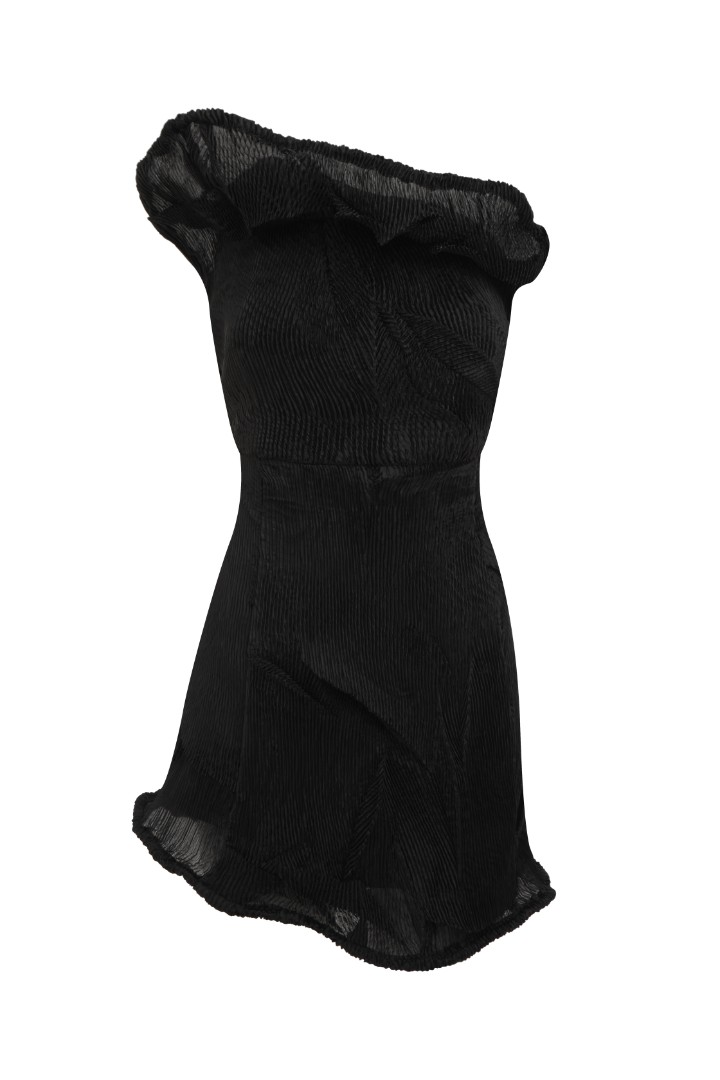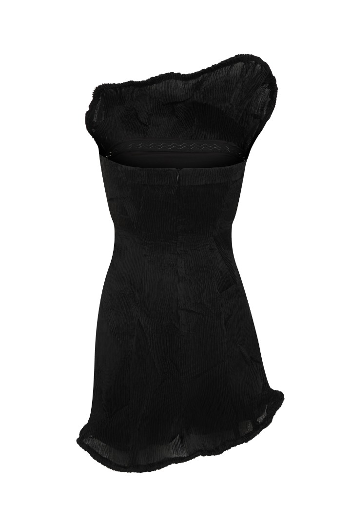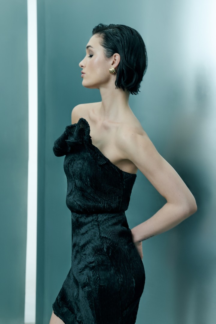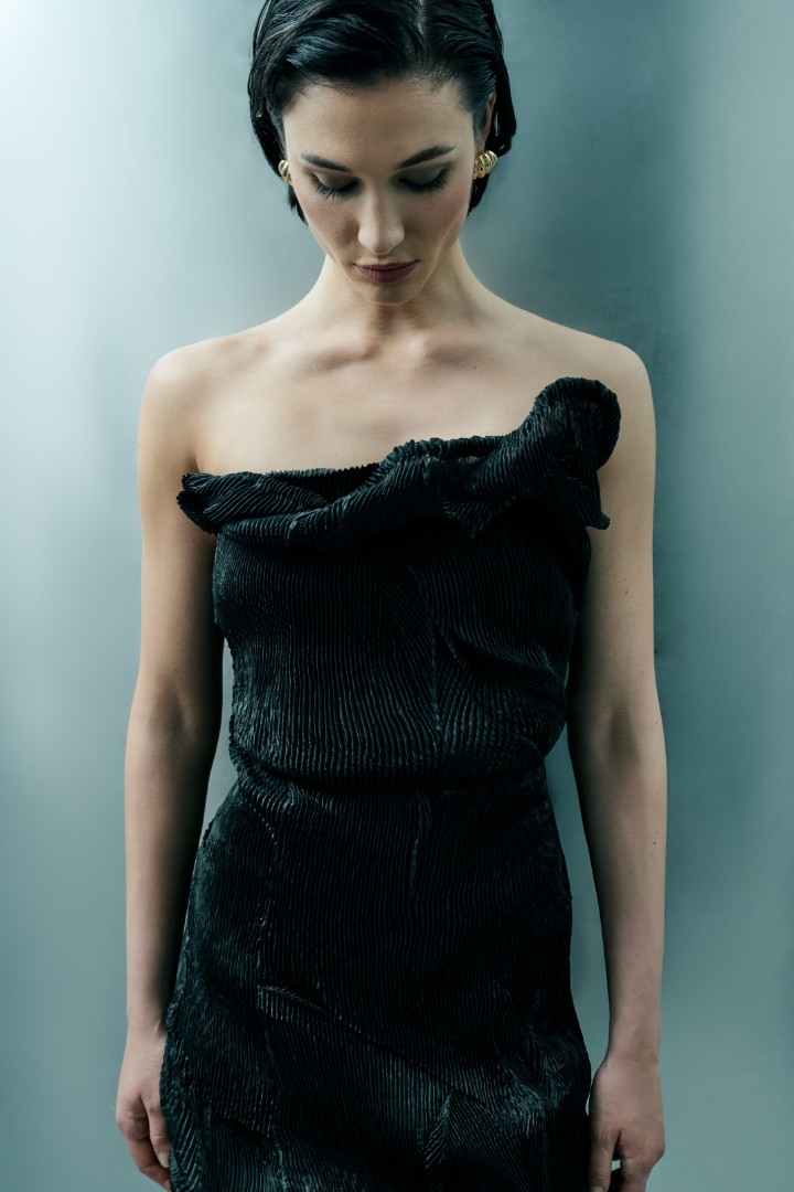 Мини-платье из ткани с жатым эффектом – главный вызов новогодней коллекции. Металлическая нить по вырезу платья дает возможность играть с изделием, индивидуально корректируя его по фигуре. Платье запоминает именно ту форму, которую вы ему придали, отражая истинную вас в каждом моменте.