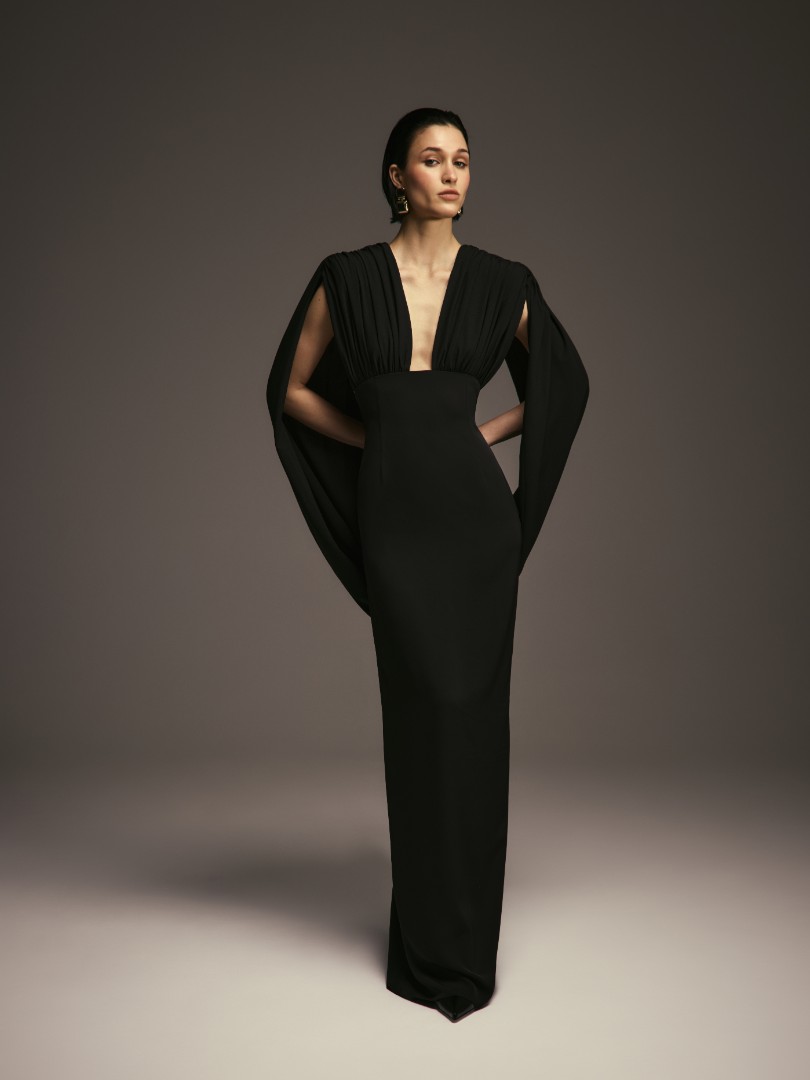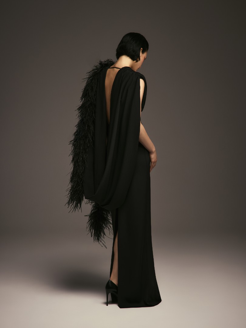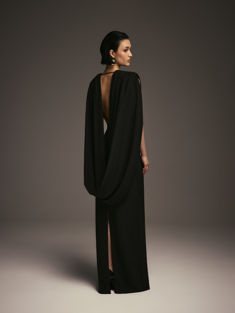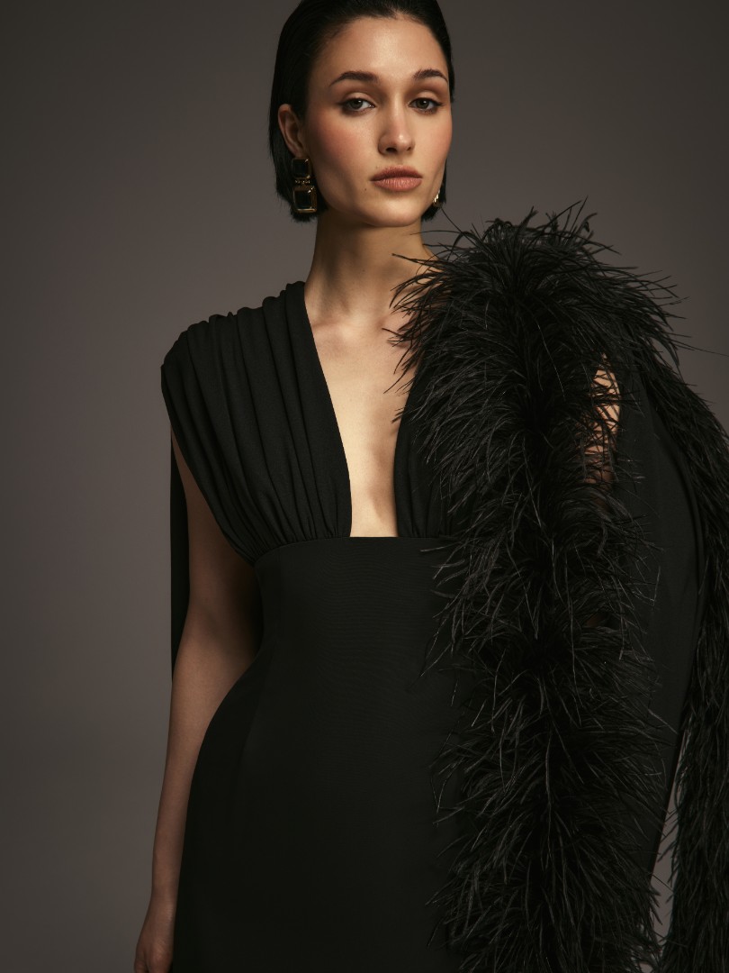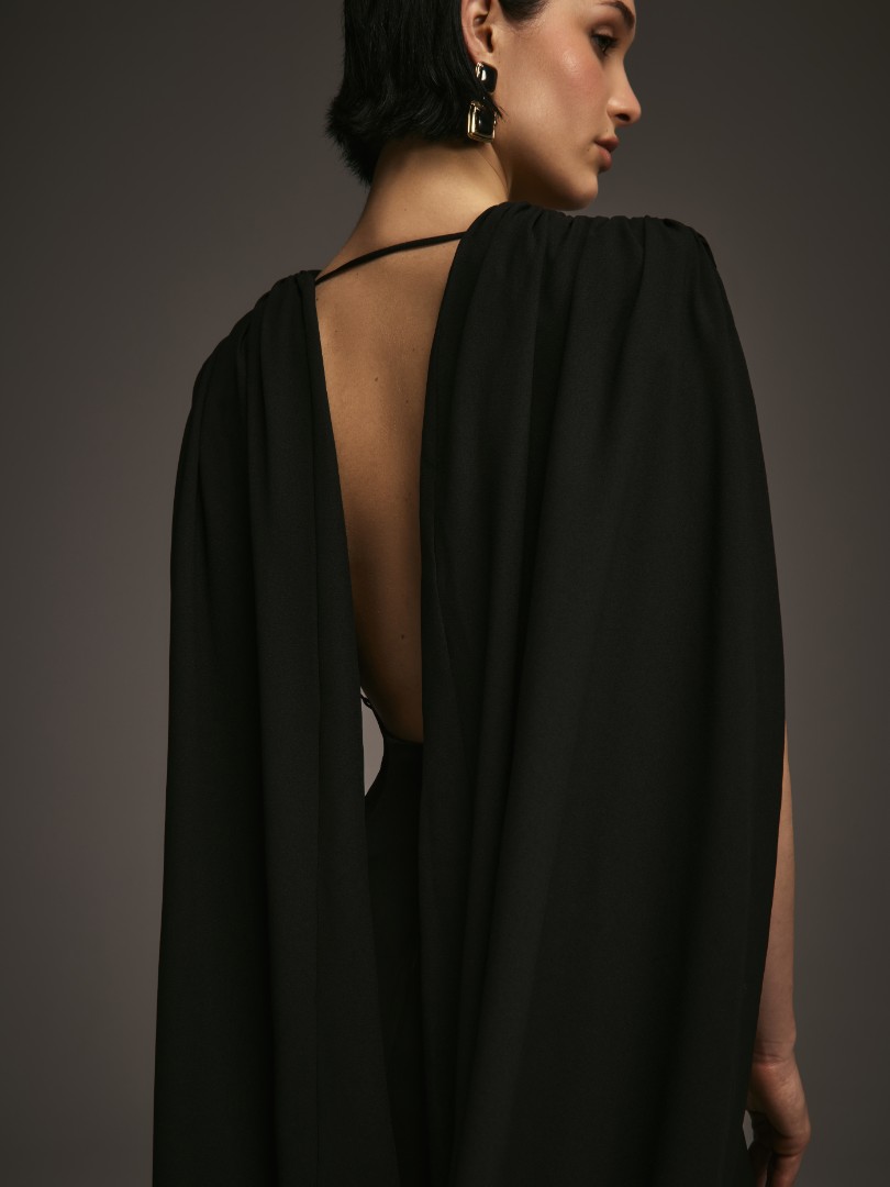Элегантное черное платье с качелью на спине, как главный символ женской сексуальности и завораживающей силы. Платье тонко подчеркивает силуэт, а акцентная деталь создает неповторимый эффект, позволяющий ощутить себя главной героиней старого кинематографа.