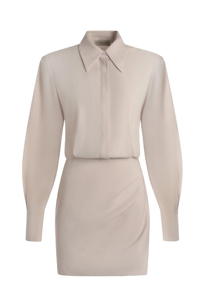 Мини-платье рубашечного кроя. Верх с подплечниками и удлиненными рукавами с широкими манжетами. Асимметричная драпировка на юбке.