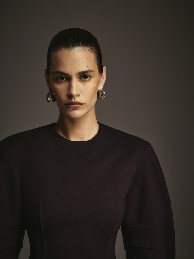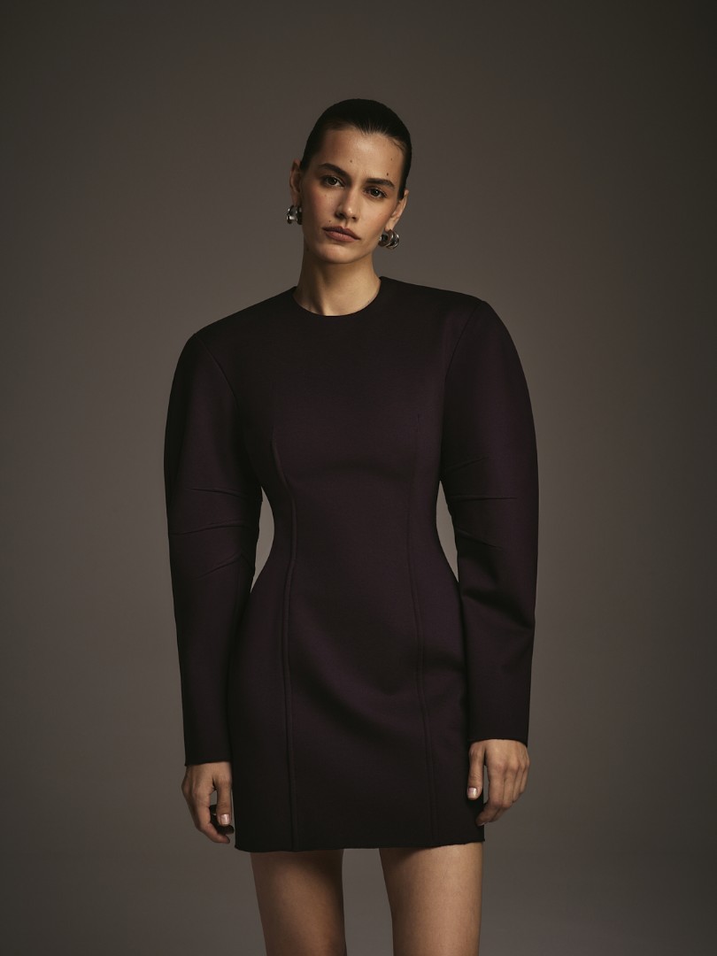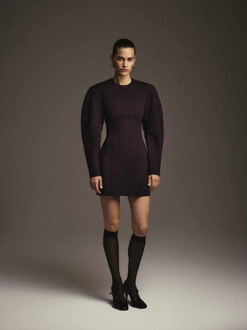 Мини-платье приталенного кроя из плотной ткани джерси. Объёмная плечевая линия, круглый вырез и декоративные вытачки на рукавах. Рельефные швы для создания приталенного силуэта. Застёжка на потайную молнию сзади.
