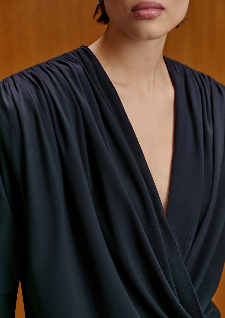 Мини-платье на запах с v-образным вырезом и длинными рукавами. Модель из плотного эластичного трикотажа с подплечниками и асимметричными драпировками по всей длине изделия.