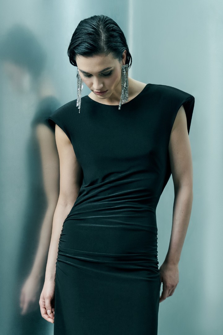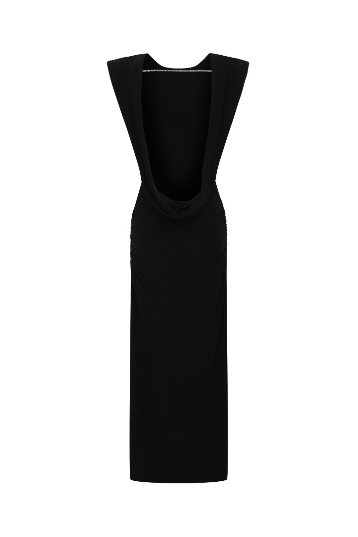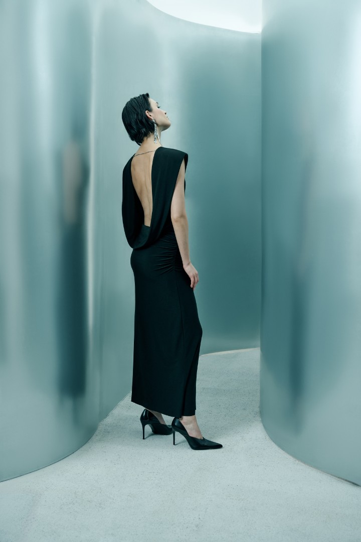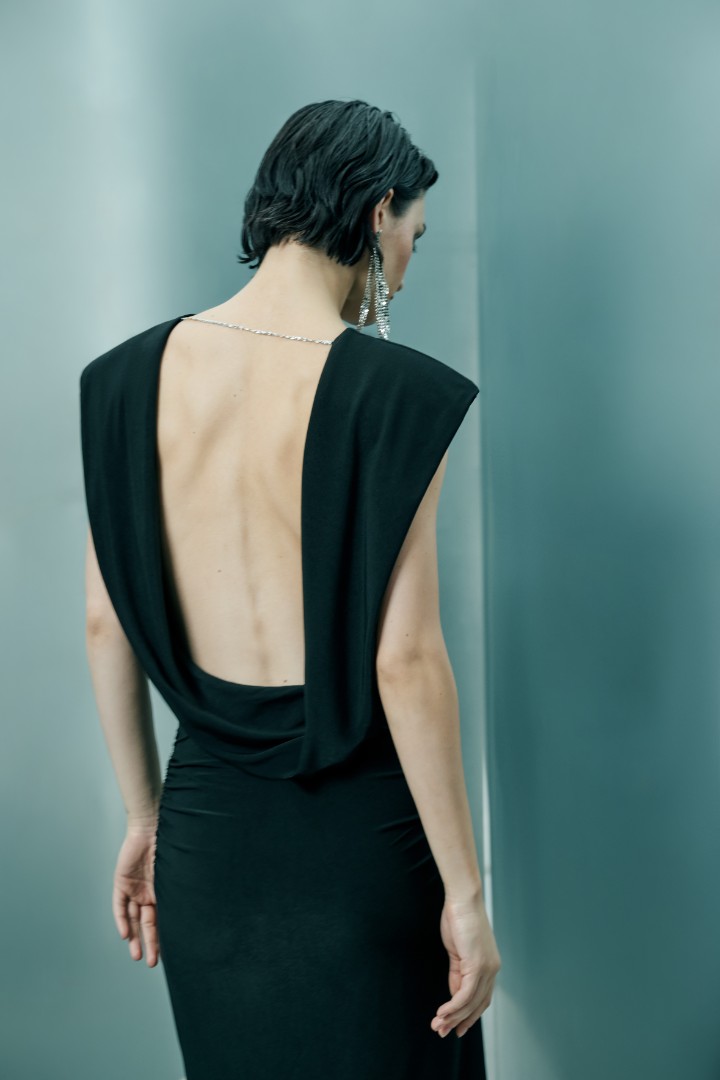 Главным элементом изделия является качель на открытой спинке, придающая спокойному платью праздничное настроение с акцентом на феминность, легкость и сдержанную откровенность.
