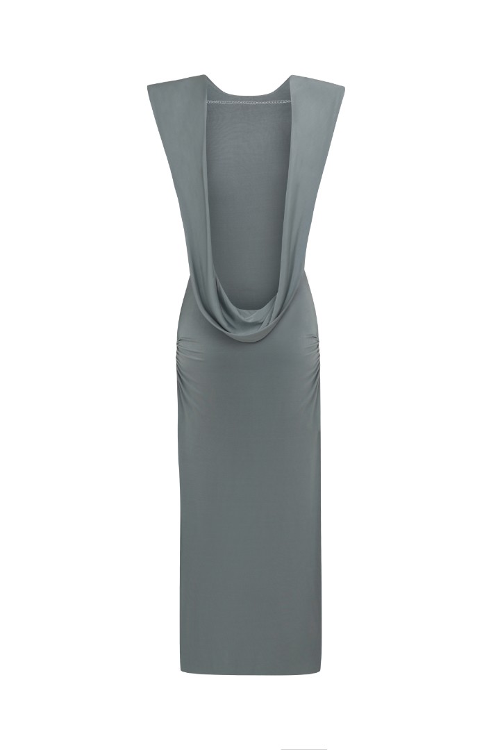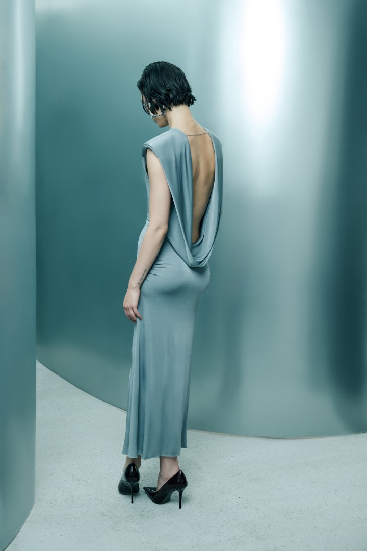 Главным элементом изделия является качель на открытой спинке, придающая спокойному платью праздничное настроение с акцентом на феминность, легкость и сдержанную откровенность.