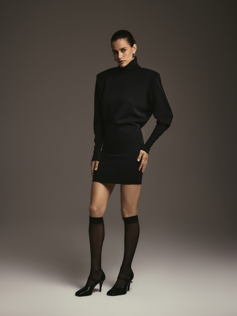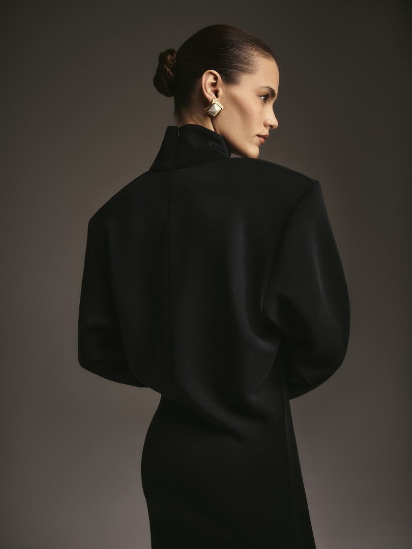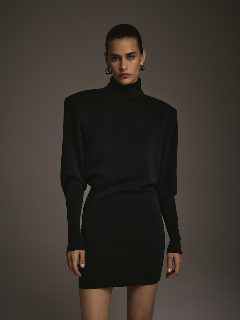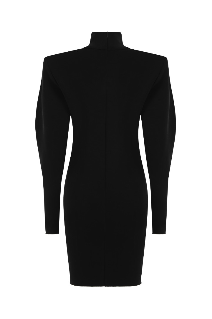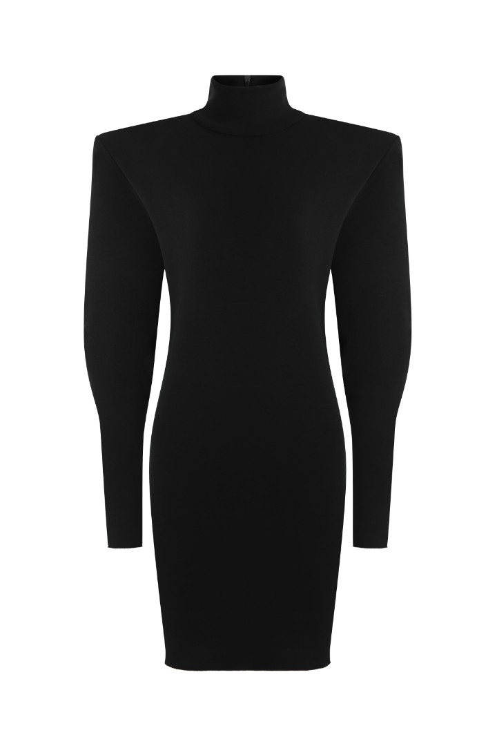 Мини-платье из плотного эластичного трикотажа с деликатным сатиновым блеском. Графичные подплечники, воротник-стойка и облегающий низ рукава. Застёжка на потайную молнию сзади.