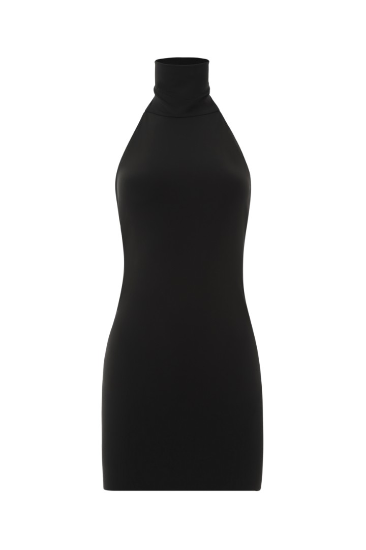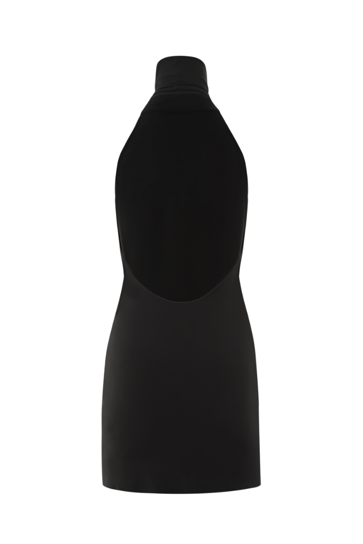 Мини-платье из эластичного бифлекса с глубоким вырезом на спине. Верх с американской проймой дополнен высоким воротником-стойкой.