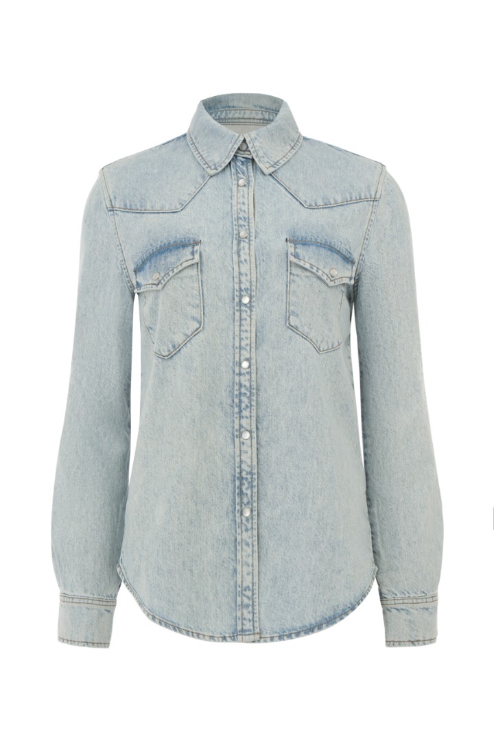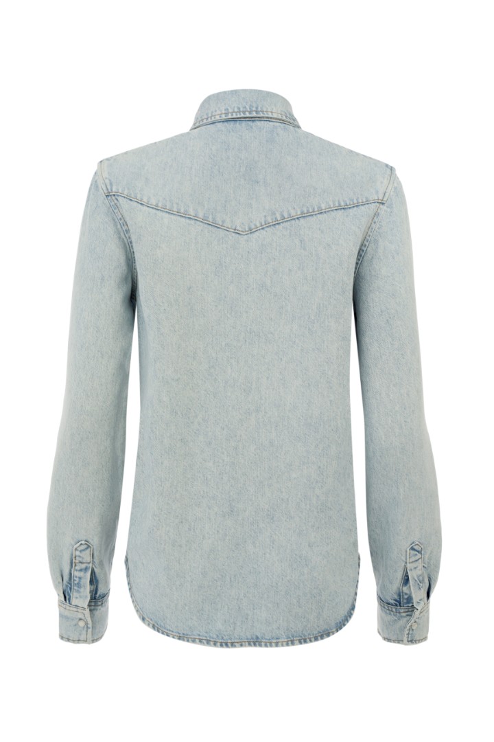 Рубашка прямого кроя с отложным воротником из облегченного премиум денима. Модель с удлиненными рукавами и нагрудными карманами с клапанами выполнена в выбеленном голубом цвете с эффектом делаве. Идеальный выбор для создания повседневного образа с ноткой ретро-шика. Сочетайте с брюками CANADIAN SET из той же ткани.