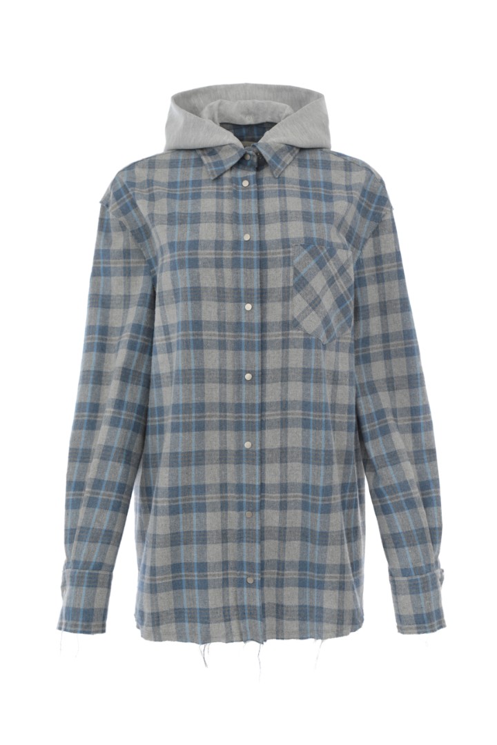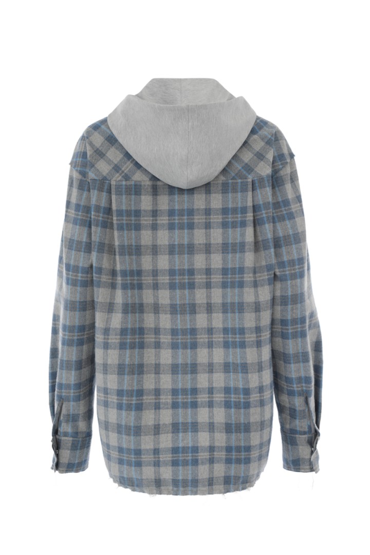 Рубашка в клетку со спущенным плечом. Декорирована необработанным краем на манжетах, нагрудном кармане, плечевом и нижнем швах. Застежка на металлические кнопки. Дополнена отстегивающимся трикотажным капюшоном.