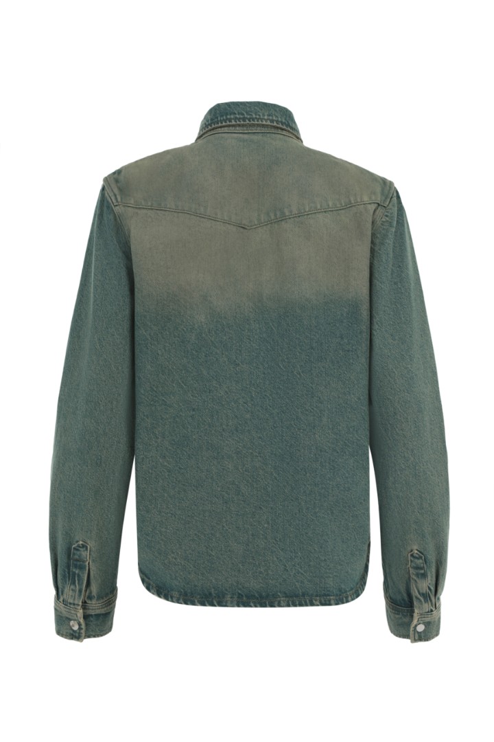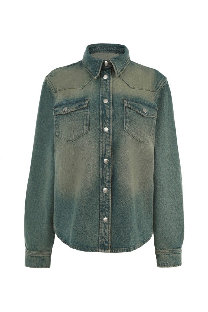 Рубашка прямого кроя из плотного денима с эффектом делаве. Отложной воротник, два нагрудных кармана с клапанами и застежка на металлические кнопки.