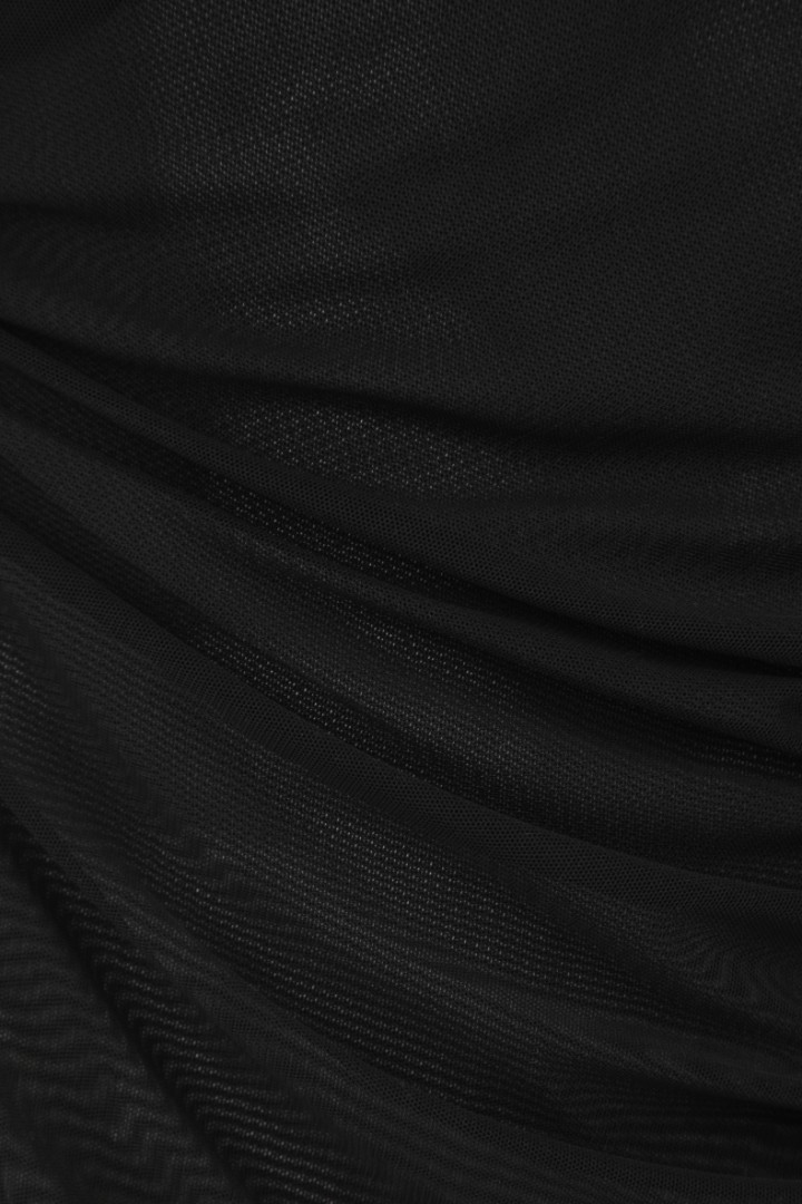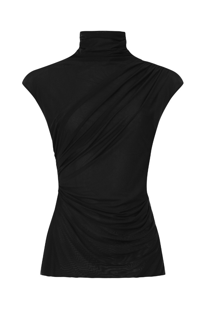 Топ облегающего кроя из тонкой сетки с асимметричной драпировкой, подчеркивающей силуэт. Воротник-стойка и короткий втачной рукав.