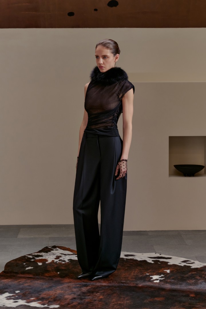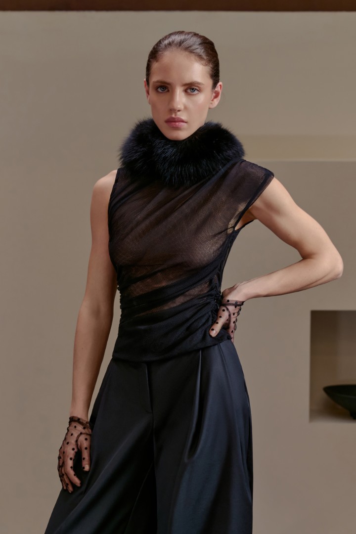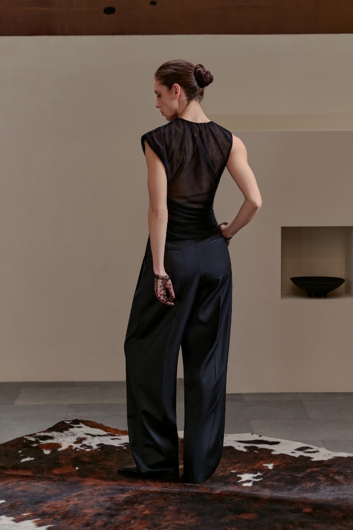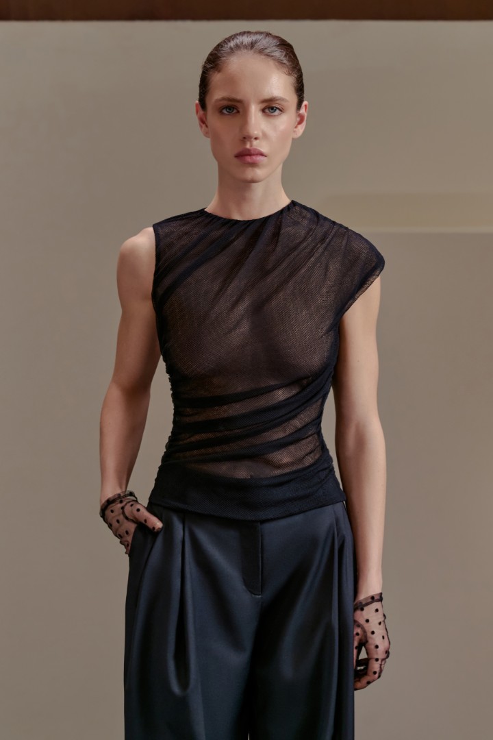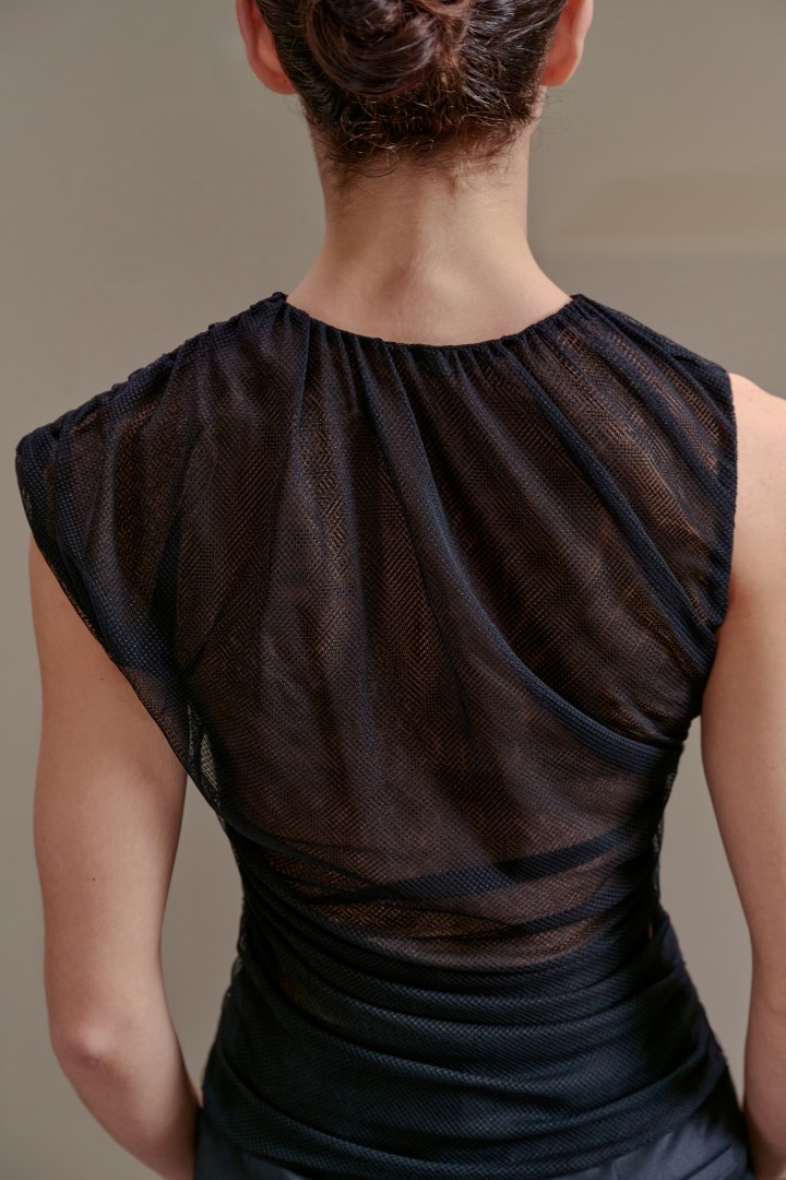Драпированный асимметричный топ из полупрозрачной сетки — игра формы, тела и света. Сборки с эластичными вставками создают выразительный силуэт, подчеркивая женственность и обеспечивая комфортную посадку.