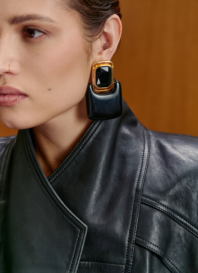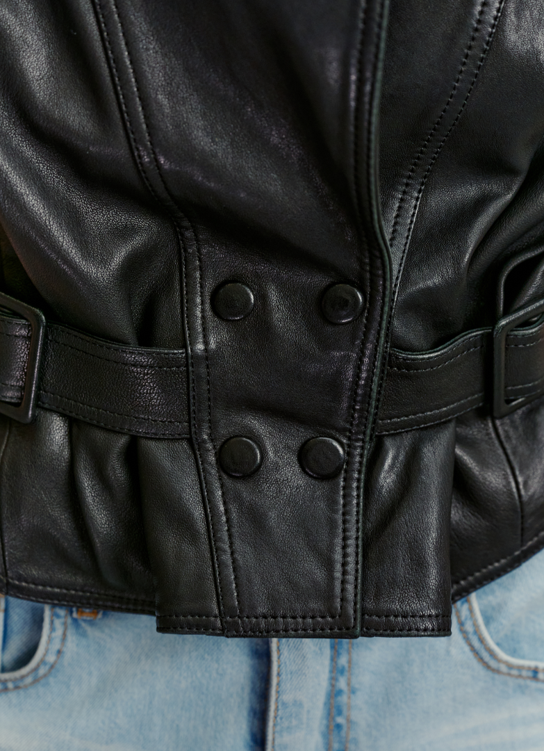 Куртка из натуральной кожи с объемной плечевой линией и широкими лацканами. Модель декорирована ремешками, регулирующими объем в области талии.