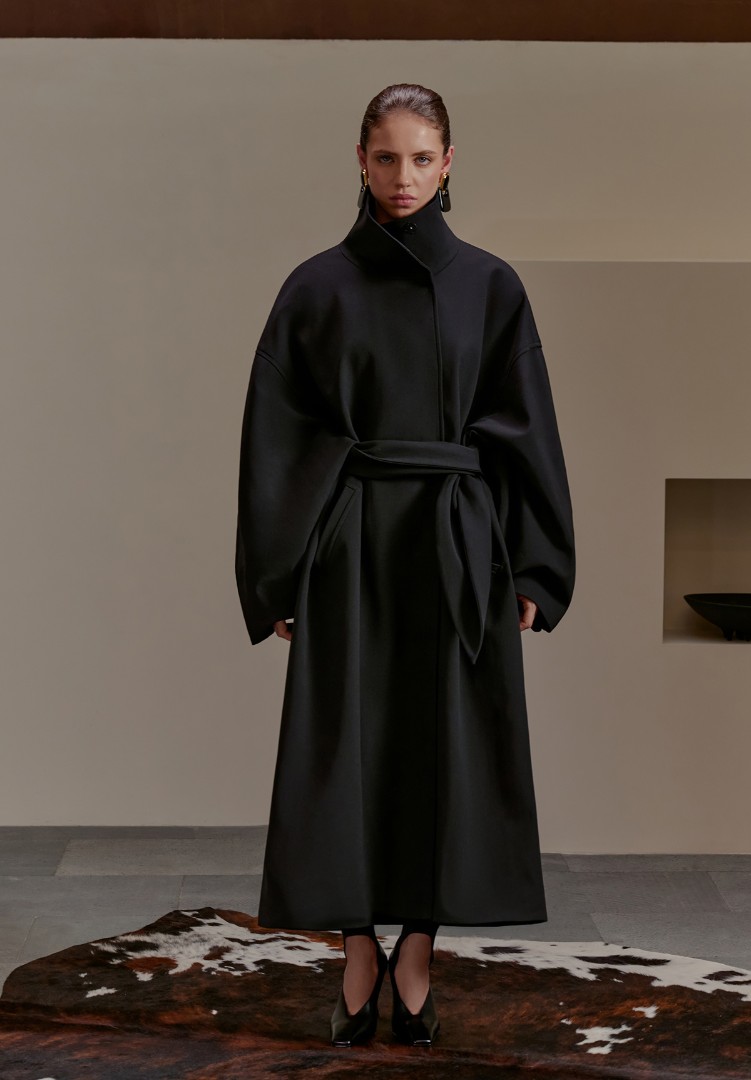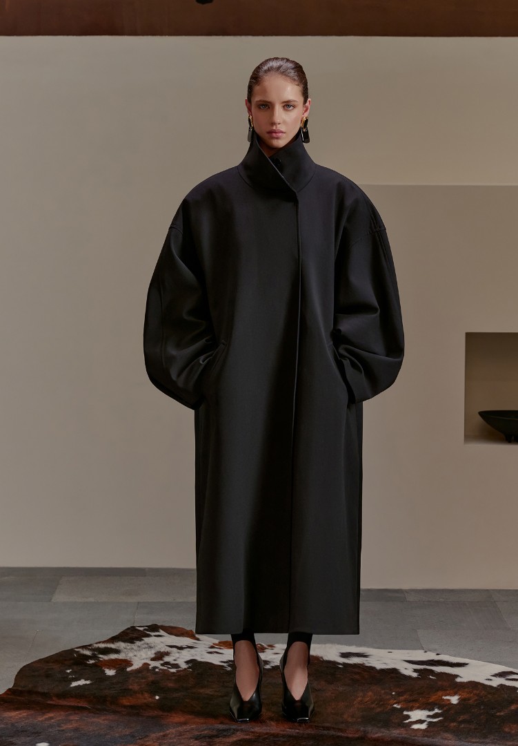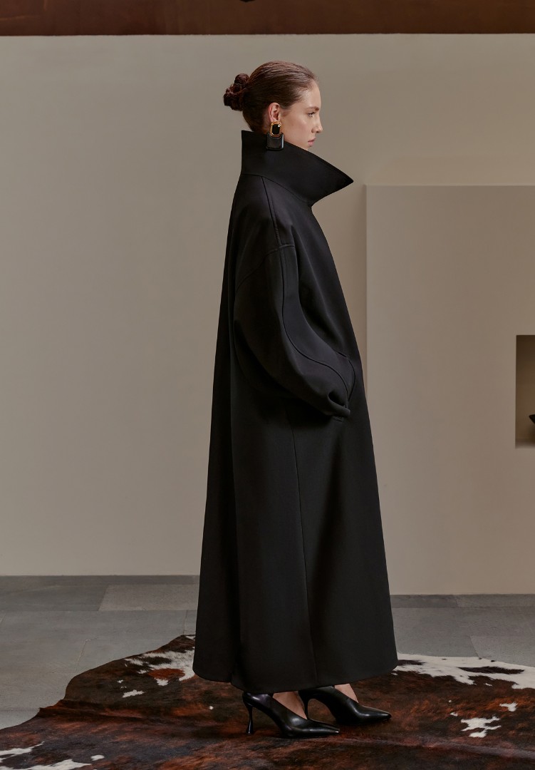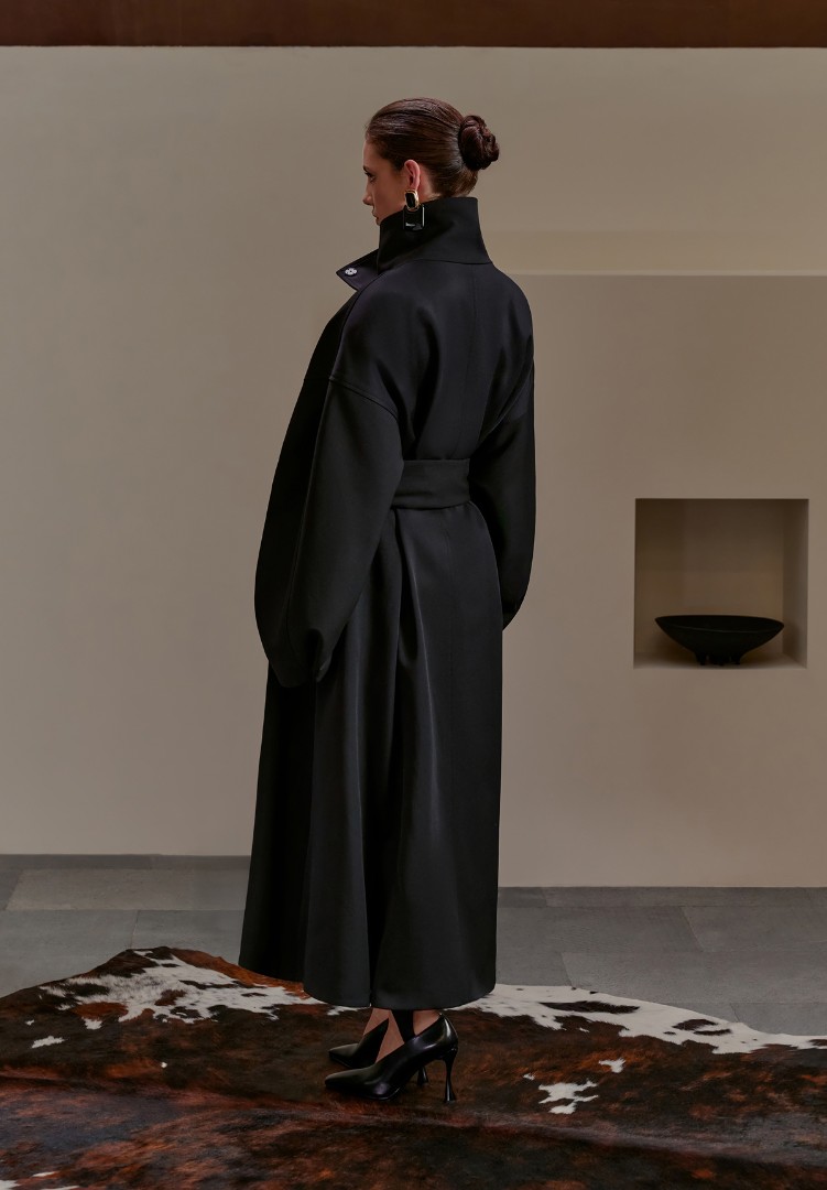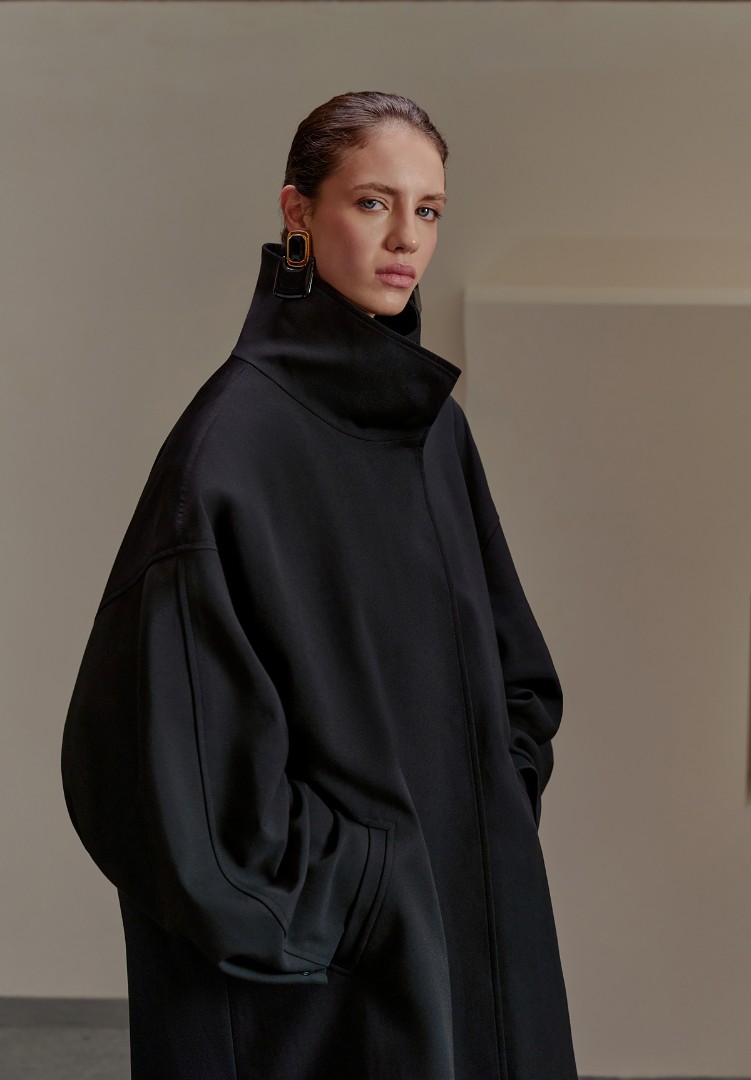 Плащ миди объемного кроя с высоким воротником-стойкой. Рукава и нижний край плаща дополнены кнопками, что позволяет регулировать объем изделия. В комплекте платок в тон ткани, который также можно использовать в качестве пояса.