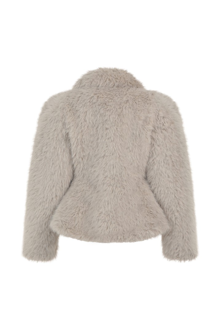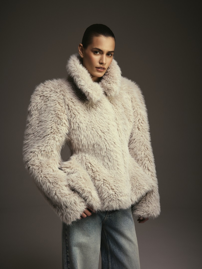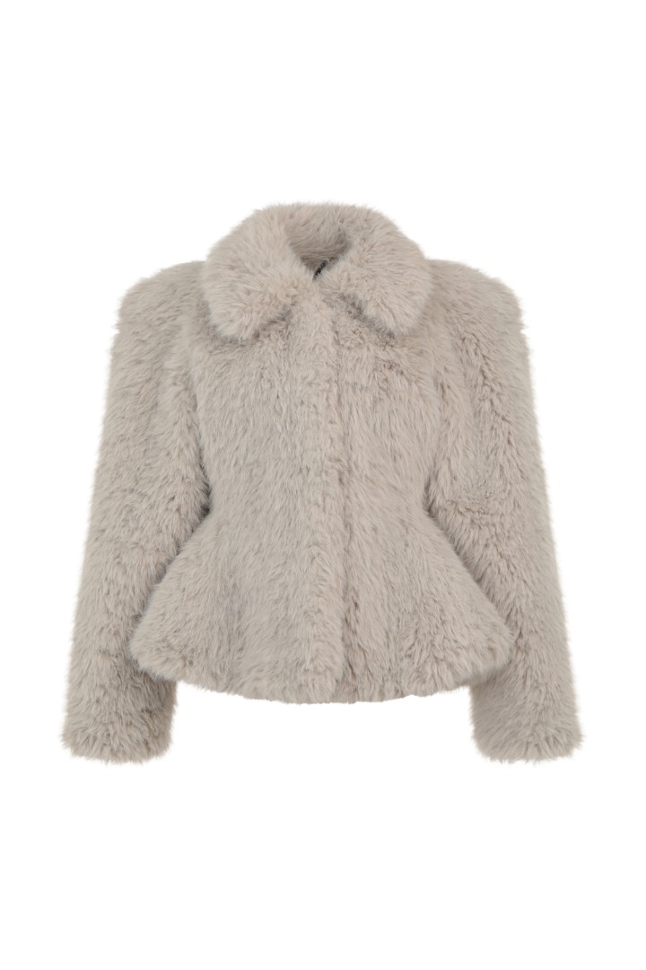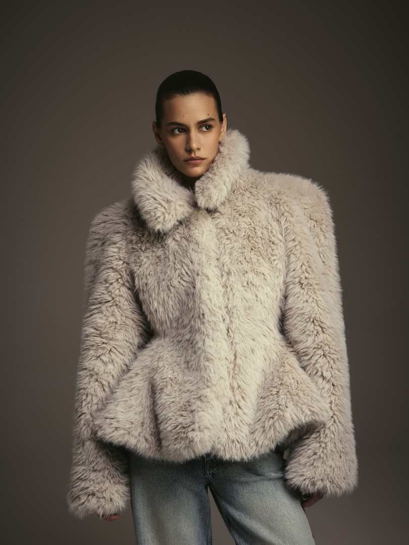 Приталенная шуба из эко-меха с длинным ворсом. Модель с баской на талии, фигурными рукавами с подплечниками и отложным воротником, трансформирующимся в стойку.