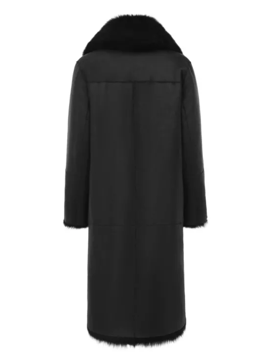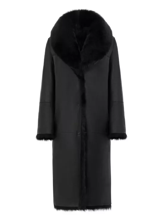 Двусторонняя шуба-дубленка из натуральной овчины. Модель длины миди дополнена широким шалевым воротником и застежкой-крючком.