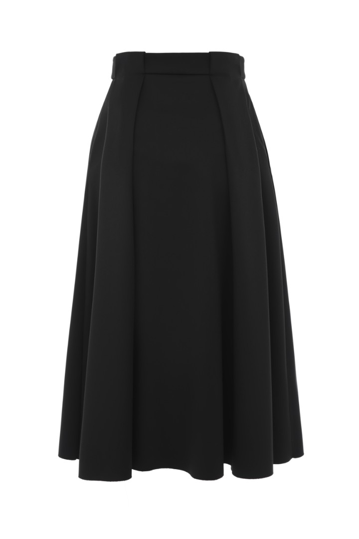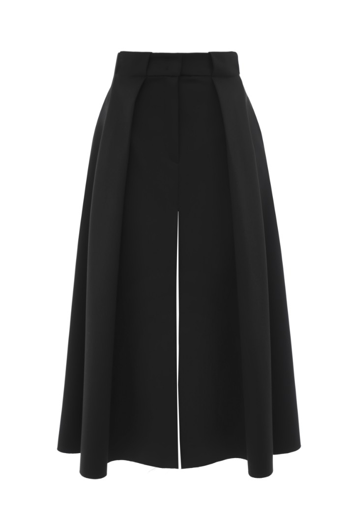 Юбка миди из костюмной ткани. Защипы на талии образуют крупные складки по всей длине. Модель декорирована высоким разрезом спереди и необработанным нижним краем. Застежка на молнию спереди.