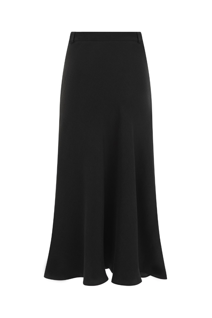 Юбка миди А-силута из струящейся ткани с лёгким сатиновым блеском. Модель со средней посадкой, шлевками для ремня и застёжкой на потайную молнию.